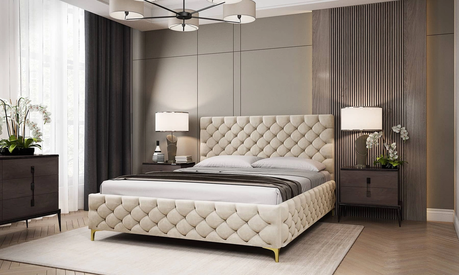 Łóżko wykonane z tkaniny typu velvet Amor Velvet 4323 gwarantuje najwyższy komfort i funkcjonalność podczas codziennego wypoczynku w sypialni. Tkanina posiada powłokę hydrofobową, co gwarantuje ograniczone wchłanianie cieczy. Tkanina wykazuje także wysoką odporność na płowienie co idealnie sprawdza się przy bardzo nasłonecznionych aranżacjach wnętrz. Niezwykle miękki, gładki materiał obiciowy Amor Velvet wyróżnia przyjemna i aksamitna w dotyku powierzchnia. Dzięki wszystkim właściwościom użytej tkaniny, łóżko na długo zachowa swój pierwotny wygląd. Konstrukcja łóżka zapewnia dużą stabilność i wygodę użytkowania. Rama łóżka jest wykonana z drewna oraz płyty meblowej. Pikowania na wezgłowiu i ramie łóżka przyciągą wzrok i nadają łóżku szczególnego charakteru.