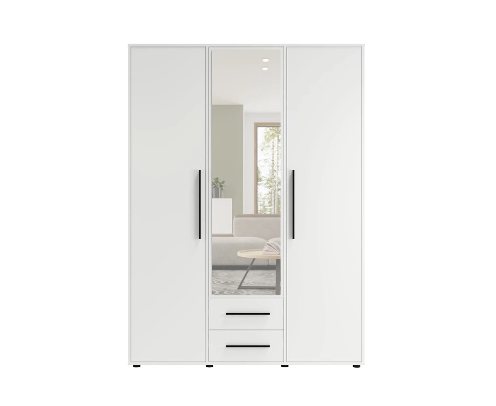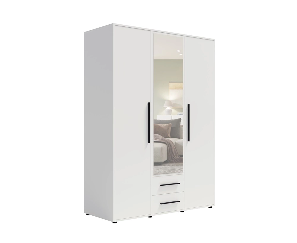 Szafa z lustrem jest skonstruowana z 3 drzwi oraz 2 szuflad. Szafa do sypialni gwarantuje komfortowe i bezproblemowe korzystanie oraz trwałość całego mebla przez wiele lat użytkowania. Ponadczasowa biel nada pomieszczeniu lekkości i przytulnego klimatu, dzięki czemu, szafa na ubrania z powodzeniem sprawdzi się jako szafa z lustrem do sypialni, jako szafa do przedpokoju lub szafa do pokoju dziecięcego. Szafa ubraniowa Maxione będzie również świetnym wyborem do pokoju młodzieżowego. Doskonale sprawdzi się także w roli garderoby do przedpokoju.