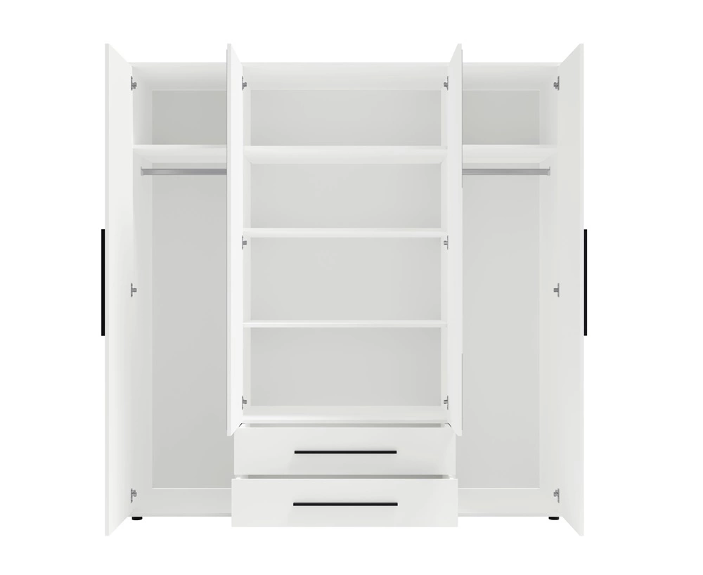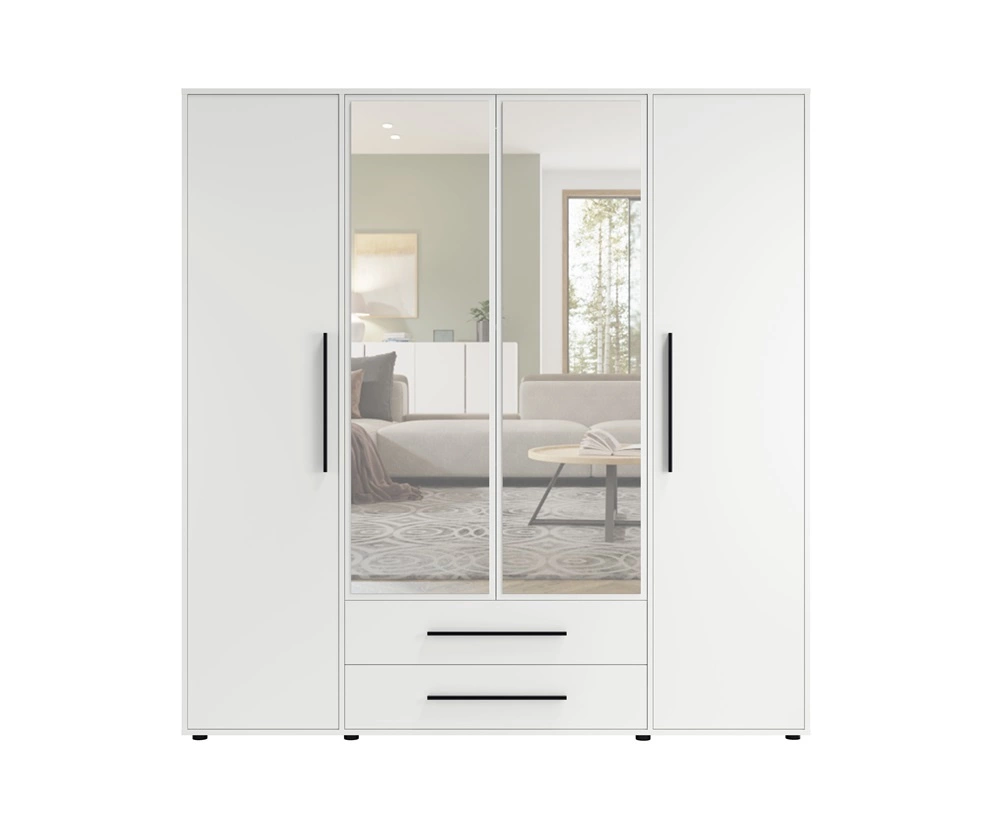Szafa z lustrem jest skonstruowana z 4 drzwi oraz 2 szuflad. Szafa do sypialni gwarantuje komfortowe i bezproblemowe korzystanie oraz trwałość całego mebla przez wiele lat użytkowania. Ponadczasowa biel nada pomieszczeniu lekkości i przytulnego klimatu, dzięki czemu, szafa na ubrania z powodzeniem sprawdzi się jako szafa z lustrem do sypialni, jako szafa do przedpokoju lub szafa do pokoju dziecięcego. Szafa ubraniowa Maxione będzie również świetnym wyborem do pokoju młodzieżowego. Doskonale sprawdzi się także w roli garderoby do przedpokoju.