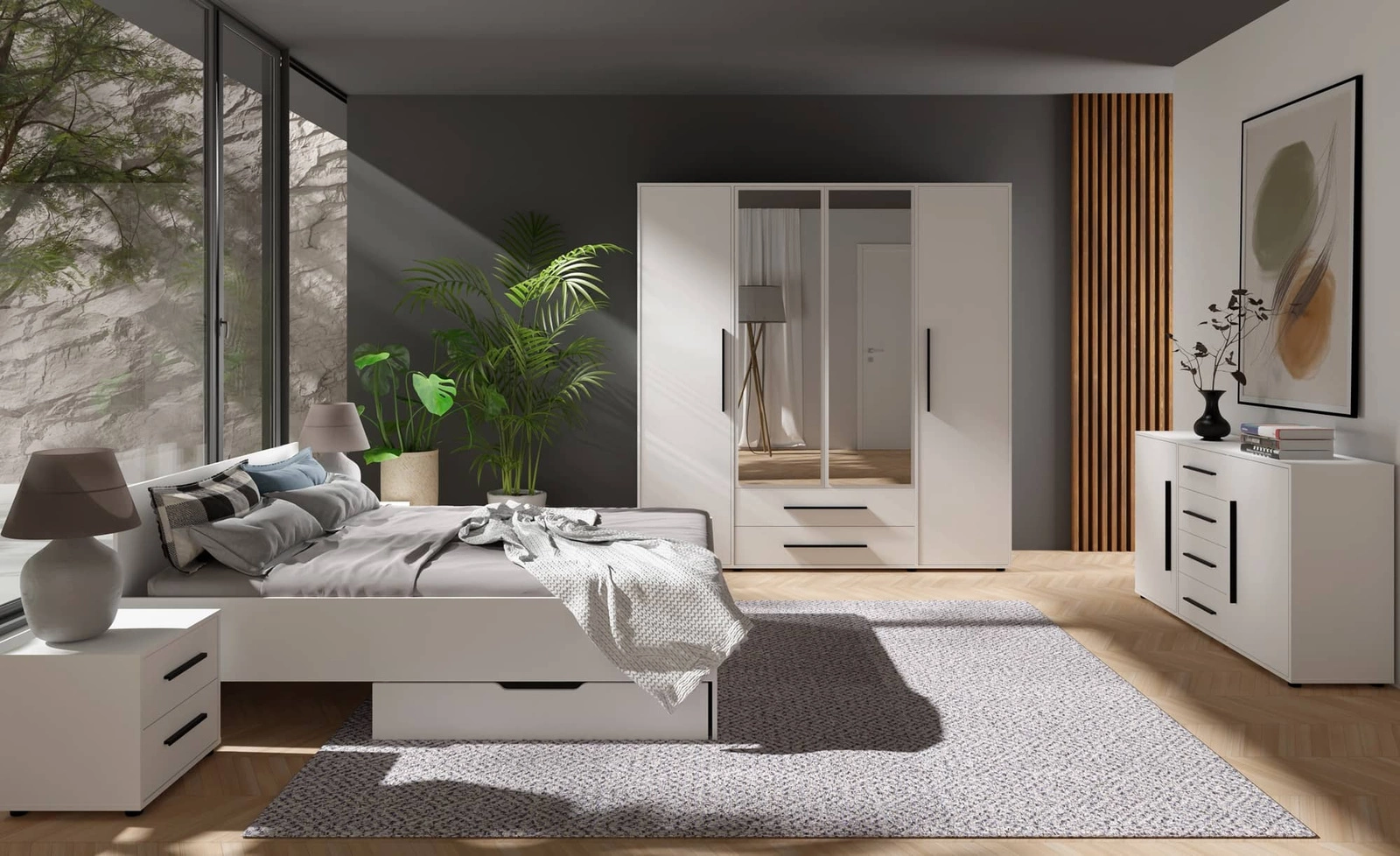 Szafa z lustrem jest skonstruowana z 4 drzwi oraz 2 szuflad. Szafa do sypialni gwarantuje komfortowe i bezproblemowe korzystanie oraz trwałość całego mebla przez wiele lat użytkowania. Ponadczasowa biel nada pomieszczeniu lekkości i przytulnego klimatu, dzięki czemu, szafa na ubrania z powodzeniem sprawdzi się jako szafa z lustrem do sypialni, jako szafa do przedpokoju lub szafa do pokoju dziecięcego. Szafa ubraniowa Maxione będzie również świetnym wyborem do pokoju młodzieżowego. Doskonale sprawdzi się także w roli garderoby do przedpokoju.