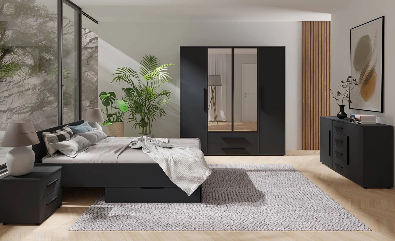 Zestaw mebli do sypialni Maxione w kolorze czarnym to proste, ale bardzo stylowe i nowoczesne meble.