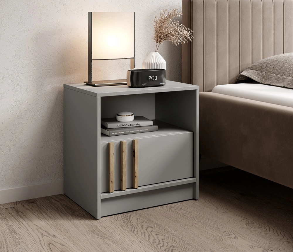 Szafka nocna z szufladą Aspen w kolorze szarym to stylowy mebel, który idealnie wkomponuje się do każdego wnętrza.