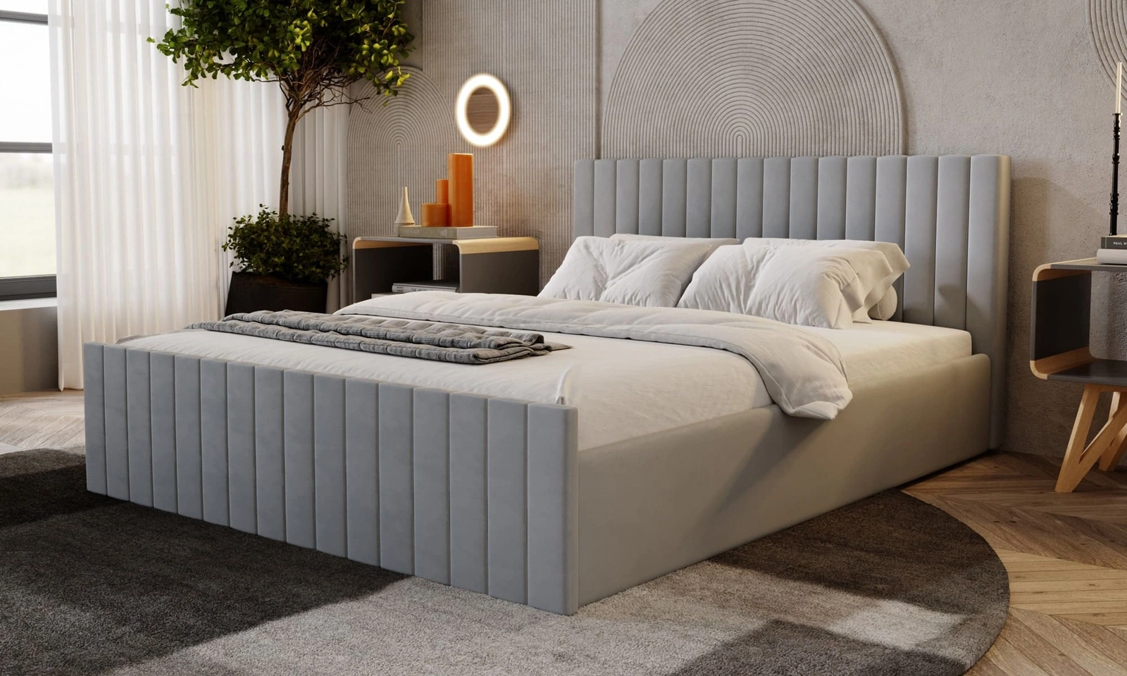 Łóżko wykonane z tkaniny typu velvet Amor Velvet 4318 gwarantuje najwyższy komfort i funkcjonalność podczas codziennego wypoczynku w sypialni. Tkanina posiada powłokę hydrofobową, co gwarantuje ograniczone wchłanianie cieczy. Tkanina wykazuje także wysoką odporność na płowienie co idealnie sprawdza się przy bardzo nasłonecznionych aranżacjach wnętrz. Niezwykle miękki, gładki materiał obiciowy Amor Velvet wyróżnia przyjemna i aksamitna w dotyku powierzchnia. Dzięki wszystkim właściwościom użytej tkaniny, łóżko na długo zachowa swój pierwotny wygląd. Konstrukcja łóżka zapewnia dużą stabilność i wygodę użytkowania. Rama łóżka jest wykonana z drewna oraz płyty meblowej. Przeszycia na wezgłowiu i ramie łóżka przyciągą wzrok i nadają łóżku szczególnego charakteru.