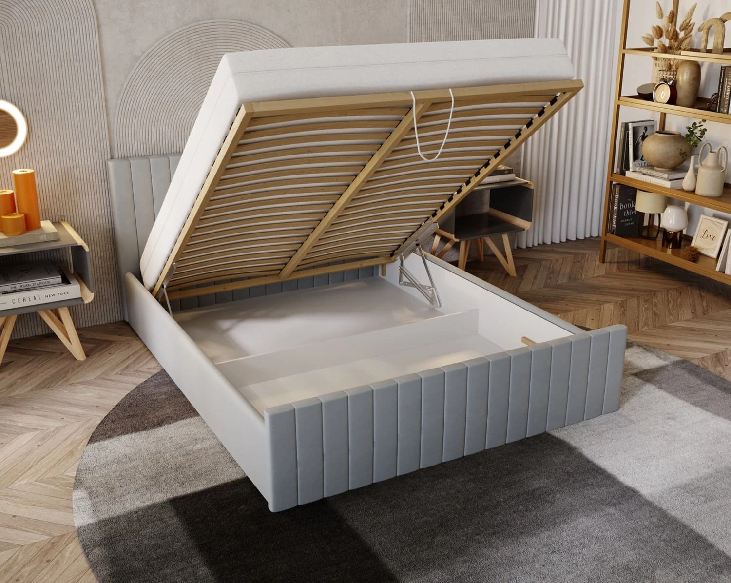Standardowym wyposażeniem łóżka jest stabilny metalowy stelaż z listwami elastycznymi. Zagęszczenie bukowych listew gwarantuje odpowiednie podparcie materaca i jego właściwe użytkowanie. Zastosowane surowce oraz solidna budowa stelaża, umożliwiają uzyskanie pełnej satysfakcji ze snu na wybranym materacu. Stelaż pod materac został wyposażony w siłowniki gazowe, co ułatwia podnoszenie.