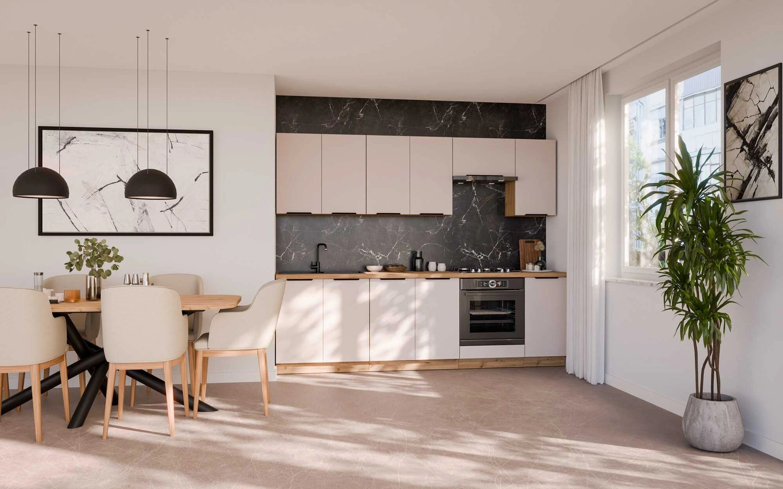 Zestaw mebli kuchennych Soela w kolorze dąb artisan / beżowy to propozycja gotowego zestawu mebli do kuchni, który doskonale prezentuje się w nowoczesnych wnętrzach.
