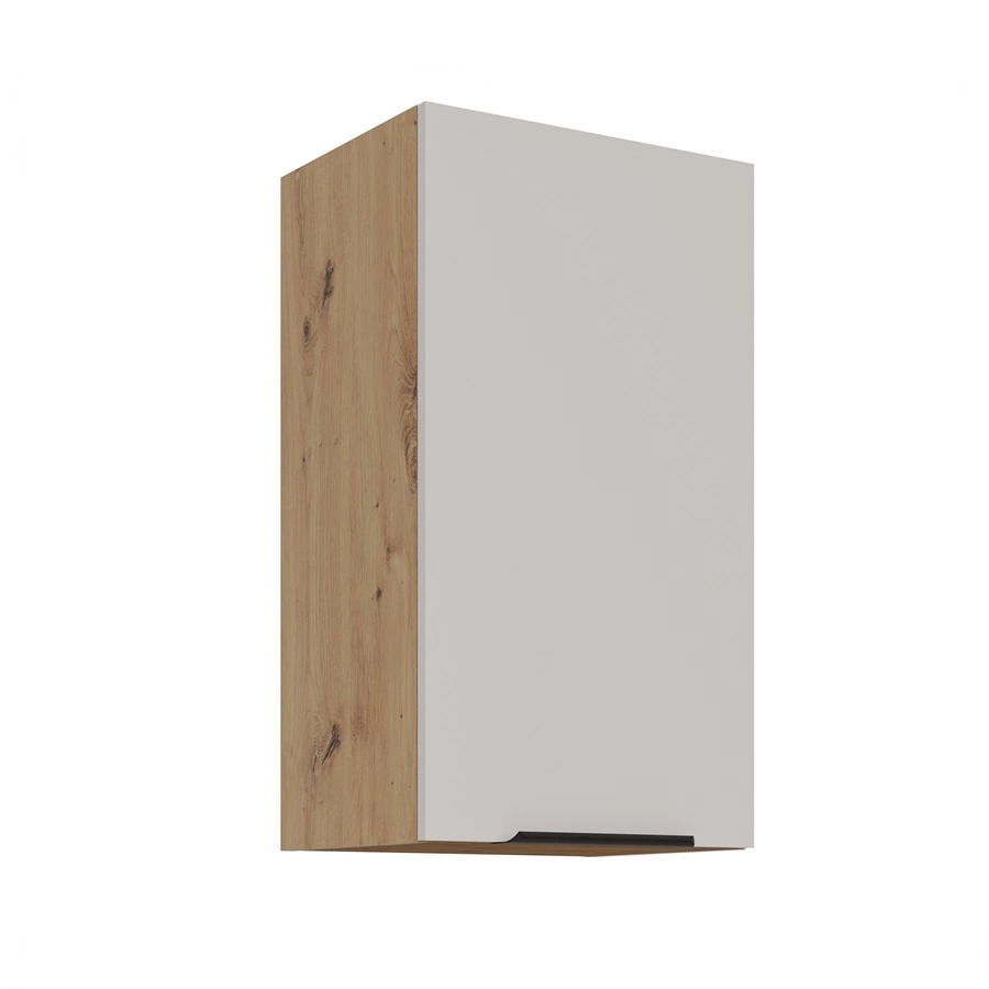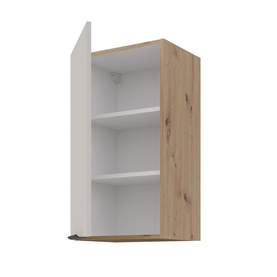 Półki nie są przykręcone do korpusów szafek, dzięki czemu można dostosować ich poziom ułożenia lub je wyciągnąć i uzyskać miejsce na wysokie przedmioty. Drzwi są uniwersalne i można je zamontować po prawej lub po lewej stronie. Szafki kuchenne górne wyposażono w system zawieszania na uniwersalnej listwie montażowej.