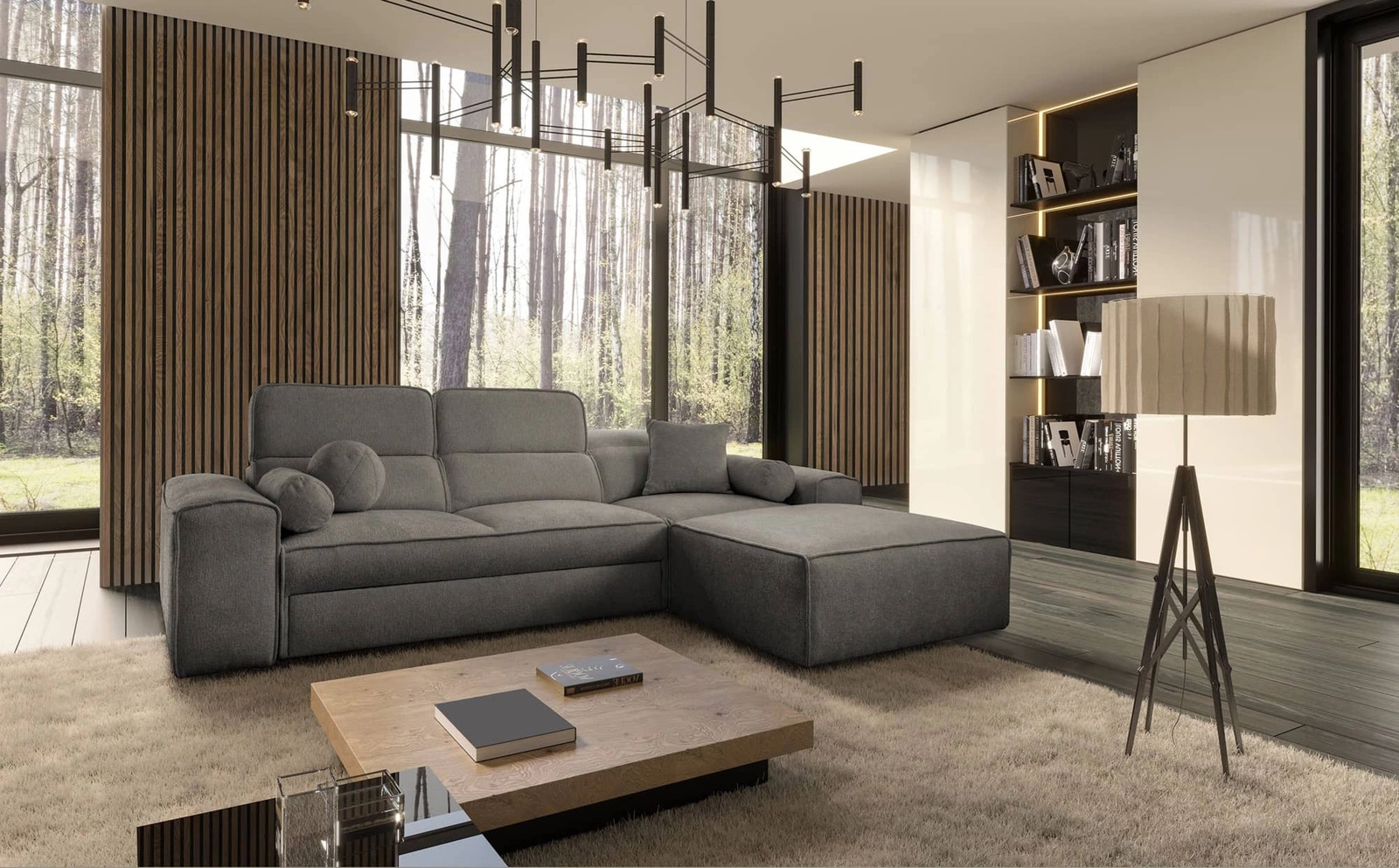 Narożnik z funkcją spania Viano szary prawostronny stylowy narożnik o ciekawym kształcie regulowane zagłówki ozdobne poduszki