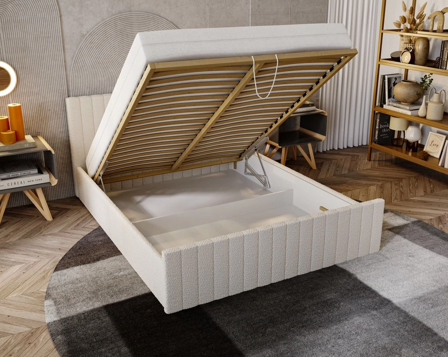 Standardowym wyposażeniem łóżka jest stabilny metalowy stelaż z listwami elastycznymi. Zagęszczenie bukowych listew gwarantuje odpowiednie podparcie materaca i jego właściwe użytkowanie. Zastosowane surowce oraz solidna budowa stelaża, umożliwiają uzyskanie pełnej satysfakcji ze snu na wybranym materacu. Stelaż pod materac został wyposażony w siłowniki gazowe, co ułatwia podnoszenie.