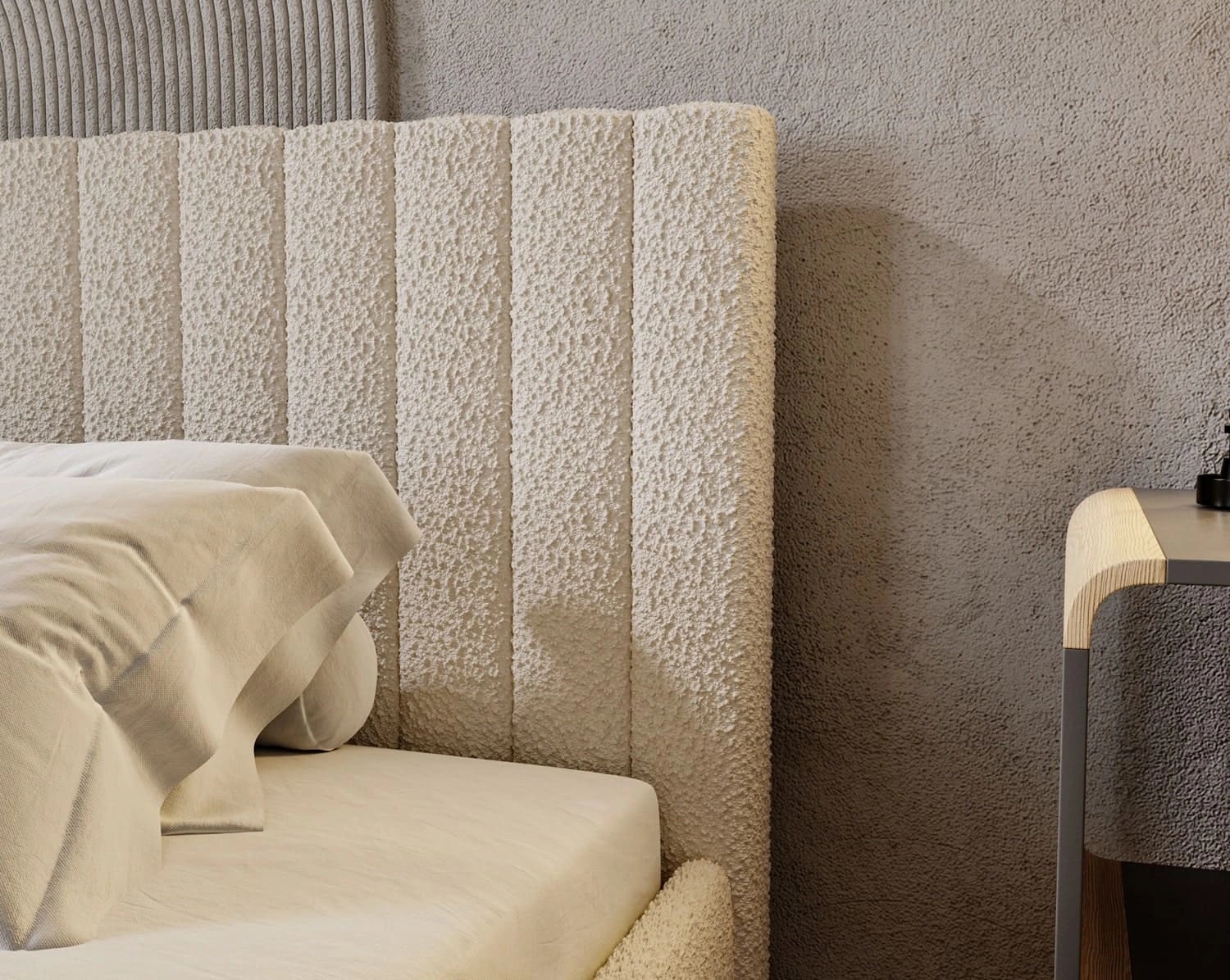 Łóżko wykonane z miękkiej i miłej w dotyku tkaniny o strukturalnej powierzchni Anthology 3 gwarantuje najwyższy komfort i funkcjonalność podczas codziennego wypoczynku w sypialni. Tkanina posiada powłokę hydrofobową, co gwarantuje ograniczone wchłanianie cieczy. Tkanina jest również trudnopalna, a także jest łatwa do utrzymania w czystości. Dodatkowym atutem tkaniny Anthology jest pętelkowa powierzchnia, która nadaje łóżku wyjątkowej urody. Charakterystyczną cechą tej tkaniny są liczne pętelki oraz supełki na powierzchni tkaniny, które posiadają nieregularny kształt oraz wielkość. Dzięki wszystkim właściwościom użytej tkaniny, łóżko na długo zachowa swój pierwotny wygląd. Konstrukcja łóżka zapewnia dużą stabilność i wygodę użytkowania. Rama łóżka jest wykonana z drewna oraz płyty meblowej. Przeszycia na wezgłowiu i ramie łóżka przyciągą wzrok i nadają łóżku szczególnego charakteru.