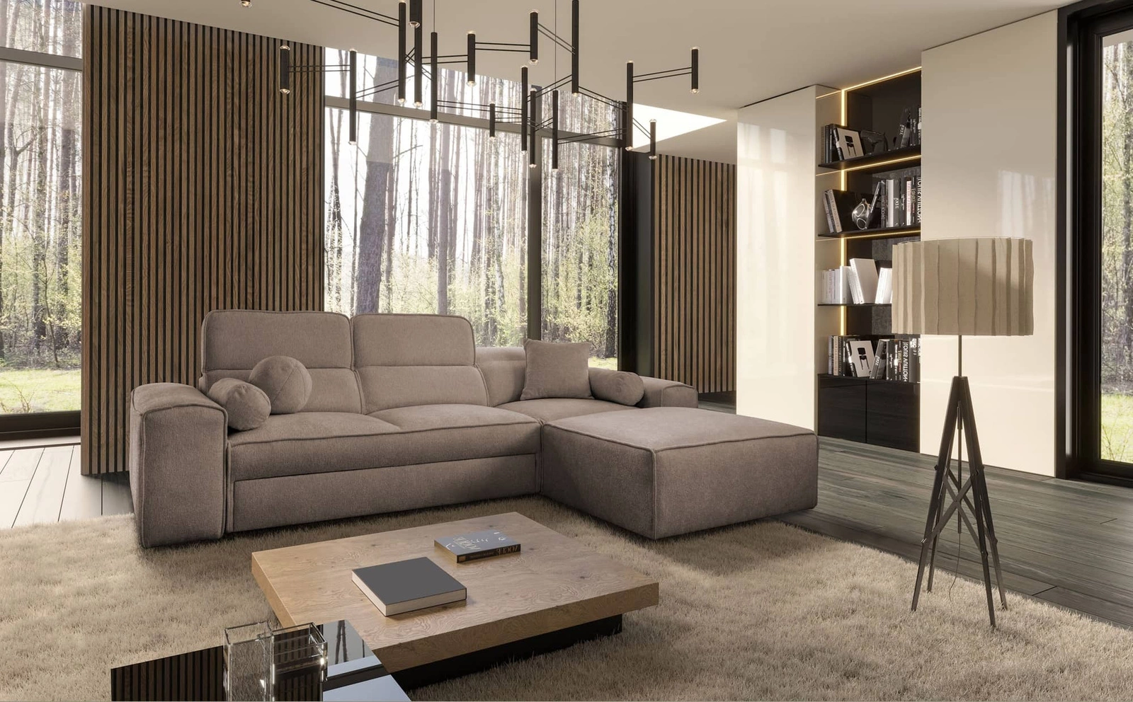 Narożnik z funkcją spania Viano jasny brąz prawostronny stylowy narożnik o ciekawym kształcie regulowane zagłówki ozdobne poduszki