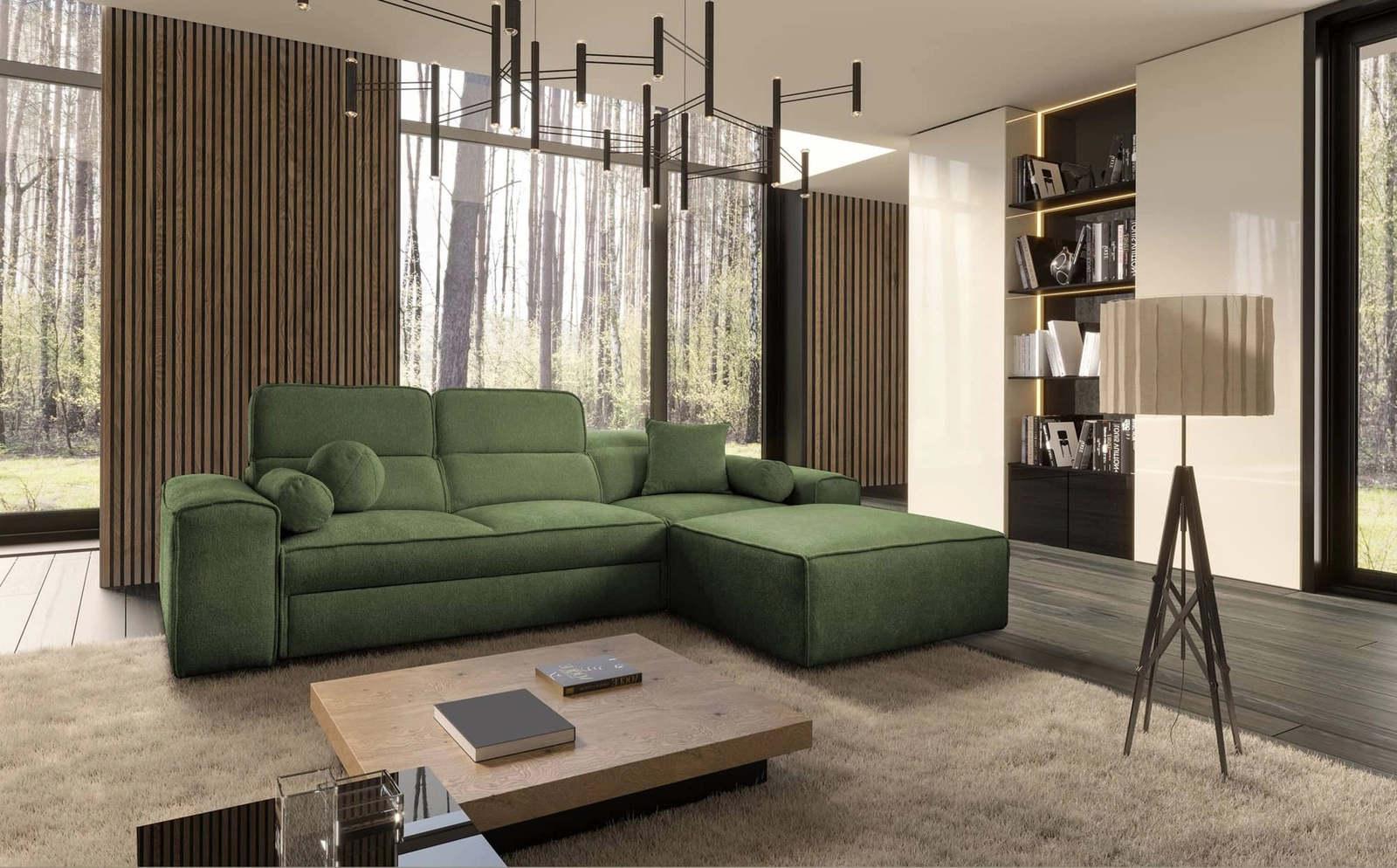 Narożnik z funkcją spania Viano zielony prawostronny stylowy narożnik o ciekawym kształcie regulowane zagłówki ozdobne poduszki