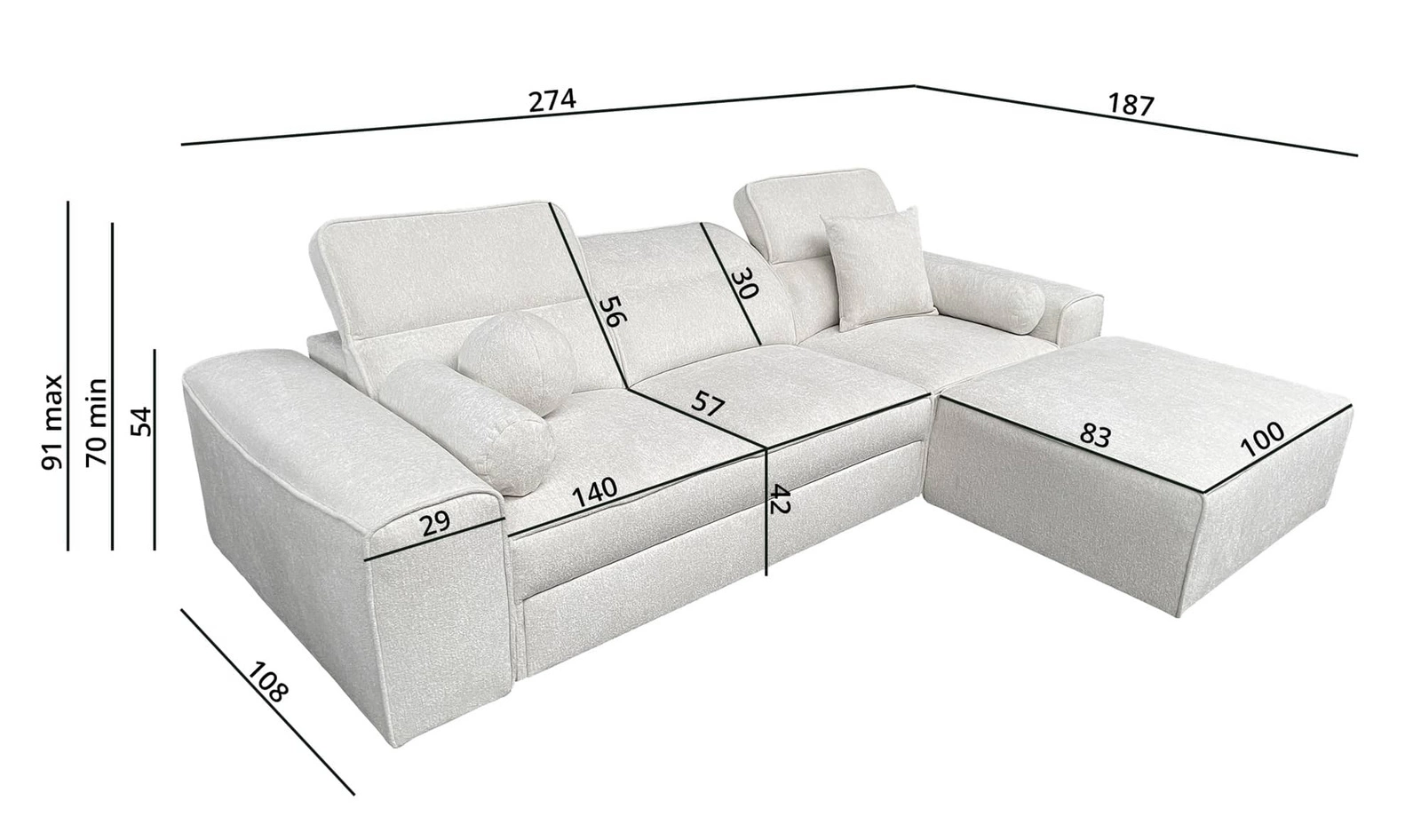 Wymiary mebla pozwolą na zagospodarowanie przestrzeni w mniejszym salonie lub pokoju dziennym. Szerokość narożnika 274 cm, wysokość 91 cm oraz głębokość 187 cm. Powierzchnia spania narożnika wynosi 127x210 cm. Wysokość siedziska mebla to 42 cm a wysokość oparcia wynosi 56 cm. Sprężyny faliste oraz pianka poliuretanowa T30 to materiał, z którego wykonane zostało siedzisko narożnika. Oparcie stałe z regulowanymi zagłówkami pozwoli na łatwe dostosowanie kąta nachylenia zagłówków do swoich preferencji oraz daje gwarancję wygodnego wypoczynku po długim dniu, które docenisz Ty, Twoi bliscy a także goście, którzy zasiądą na tym wyjątkowym narożniku.