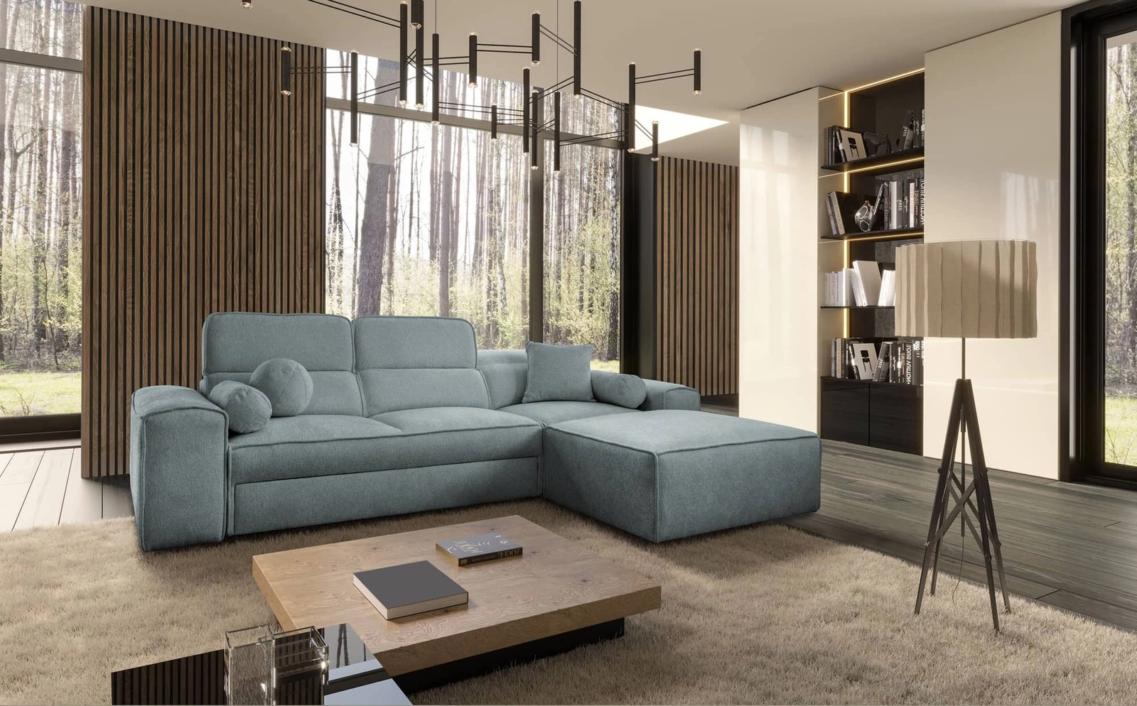 Narożnik z funkcją spania Viano szary błękit prawostronny stylowy narożnik o ciekawym kształcie regulowane zagłówki ozdobne poduszki