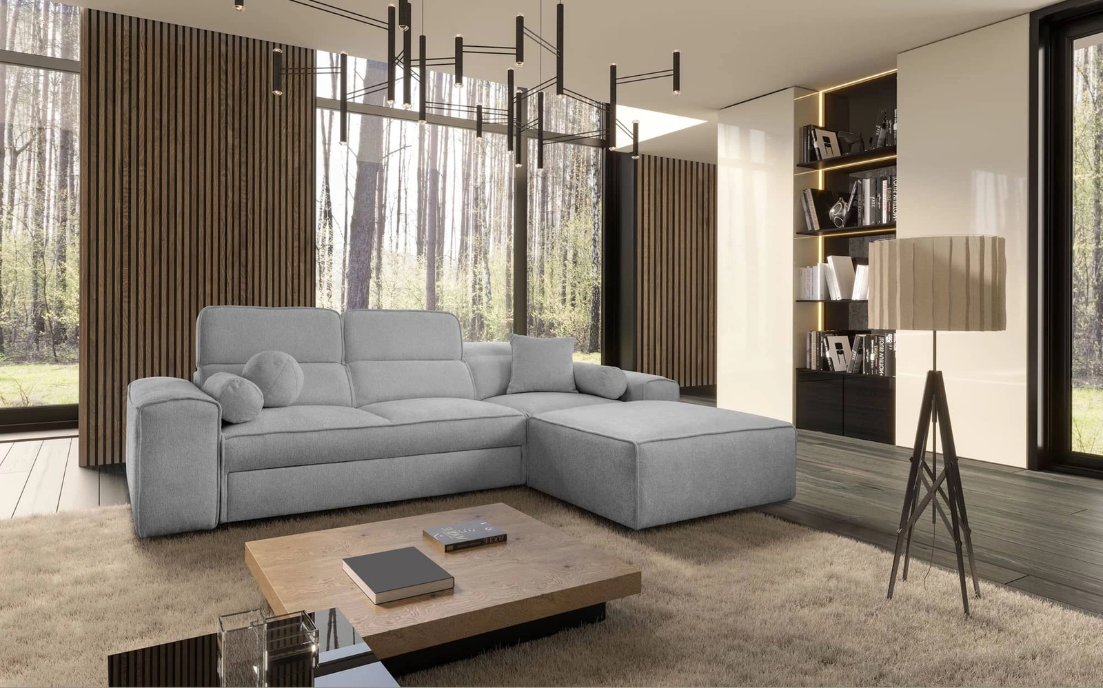 Narożnik z funkcją spania Viano jasny szary prawostronny stylowy narożnik o ciekawym kształcie regulowane zagłówki ozdobne poduszki