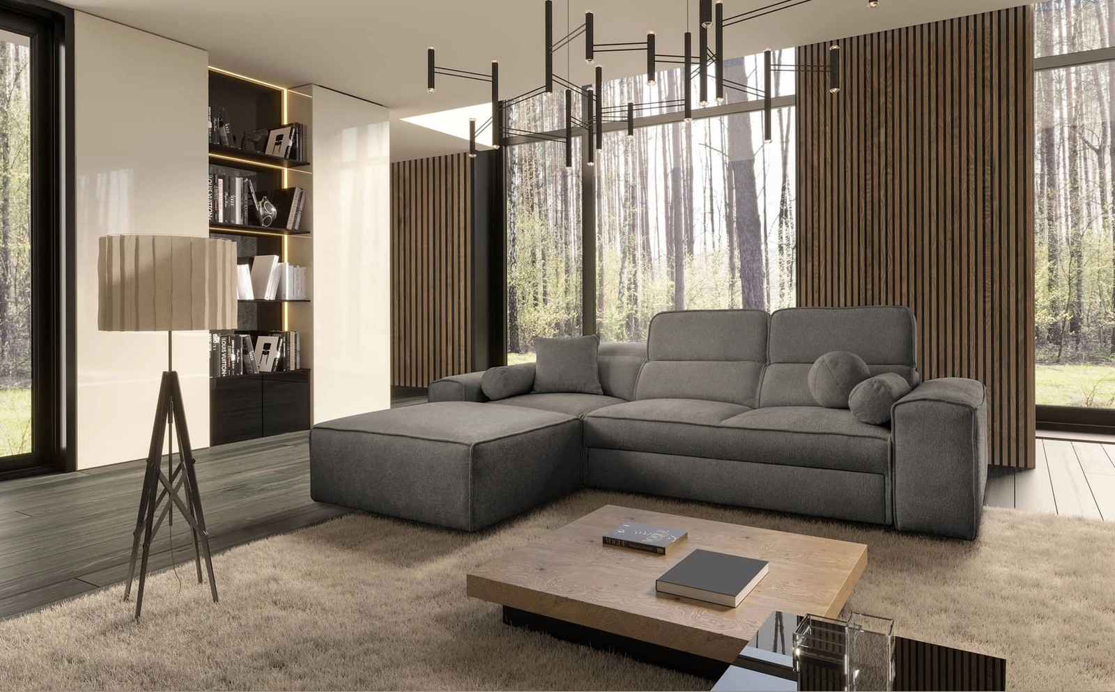 Narożnik z funkcją spania Viano szary lewostronny stylowy narożnik o ciekawym kształcie regulowane zagłówki ozdobne poduszki