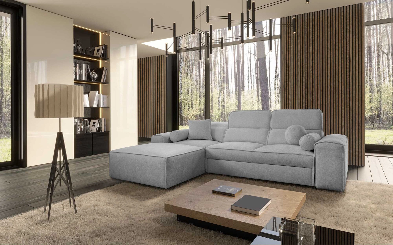 Narożnik z funkcją spania Viano jasny szary lewostronny stylowy narożnik o ciekawym kształcie regulowane zagłówki ozdobne poduszki