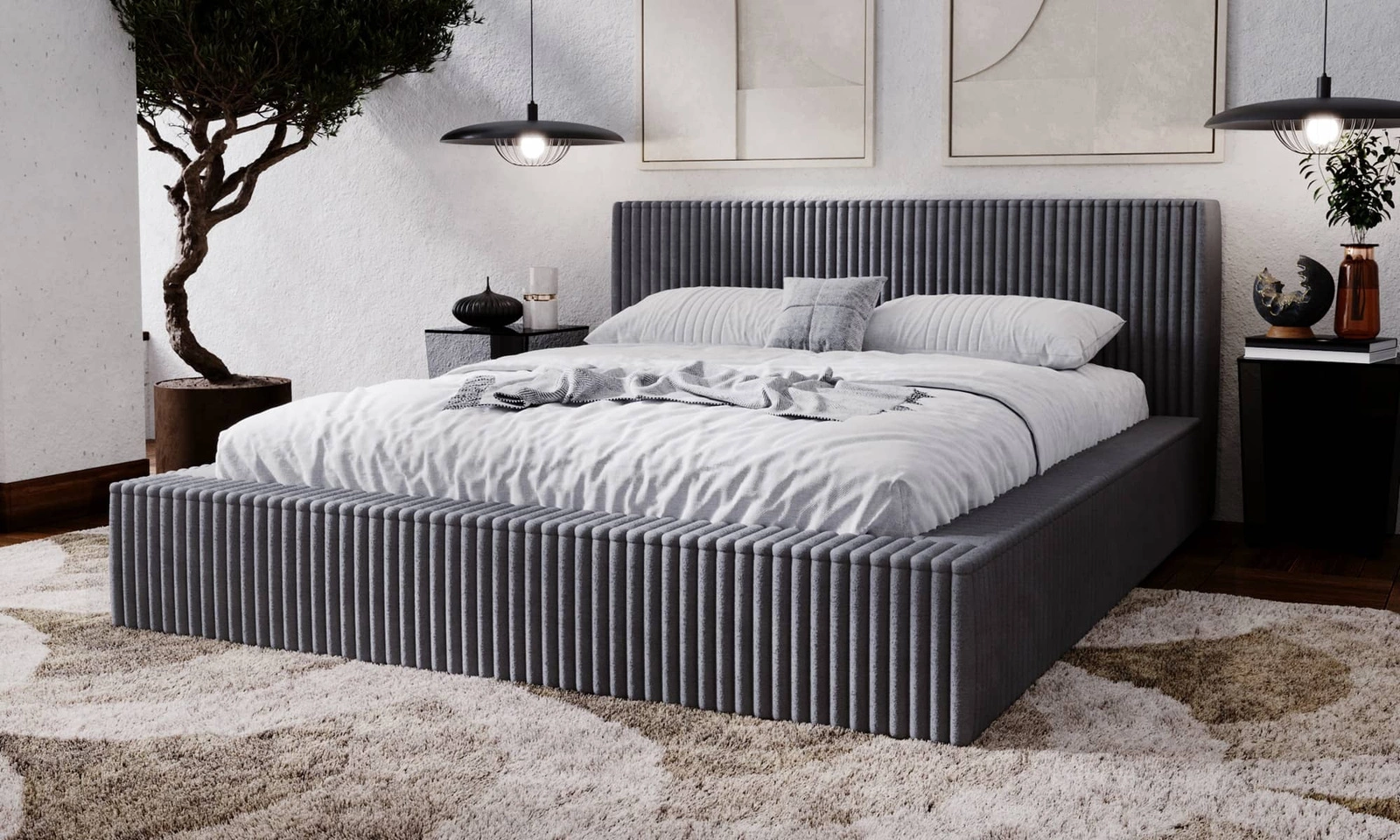 Łóżko wykonane z miękkiej i miłej w dotyku tkaniny typu futerko Vito 18 gwarantuje najwyższy komfort i funkcjonalność podczas codziennego wypoczynku w sypialni. Materiał jest bardzo miękki, a przy tym mocny i wytrzymały. Tkanina obiciowa Vito jest odporna na ścieranie, trudnopalna a także łatwa do utrzymania w czystości. Dodatkowym atutem tkaniny Vito są charakterystyczne prążki, przypominające gruby sztruks, które nadaja łóżku wyjątkowej urody. Dzięki wszystkim właściwościom użytej tkaniny, łóżko na długo zachowa swój pierwotny wygląd. Konstrukcja łóżka zapewnia dużą stabilność i wygodę użytkowania. Rama łóżka jest wykonana z drewna oraz płyty meblowej. Delikatne przeszycia na wezgłowiu i ramie łóżka przyciągą wzrok i nadają łóżku szczególnego charakteru.