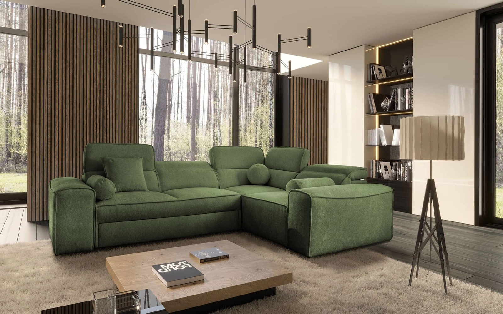 Narożnik z funkcją spania Viano II zielony prawostronny designerski narożnik rozkładany idealnie wpisujący się w nowoczesne aranżacje