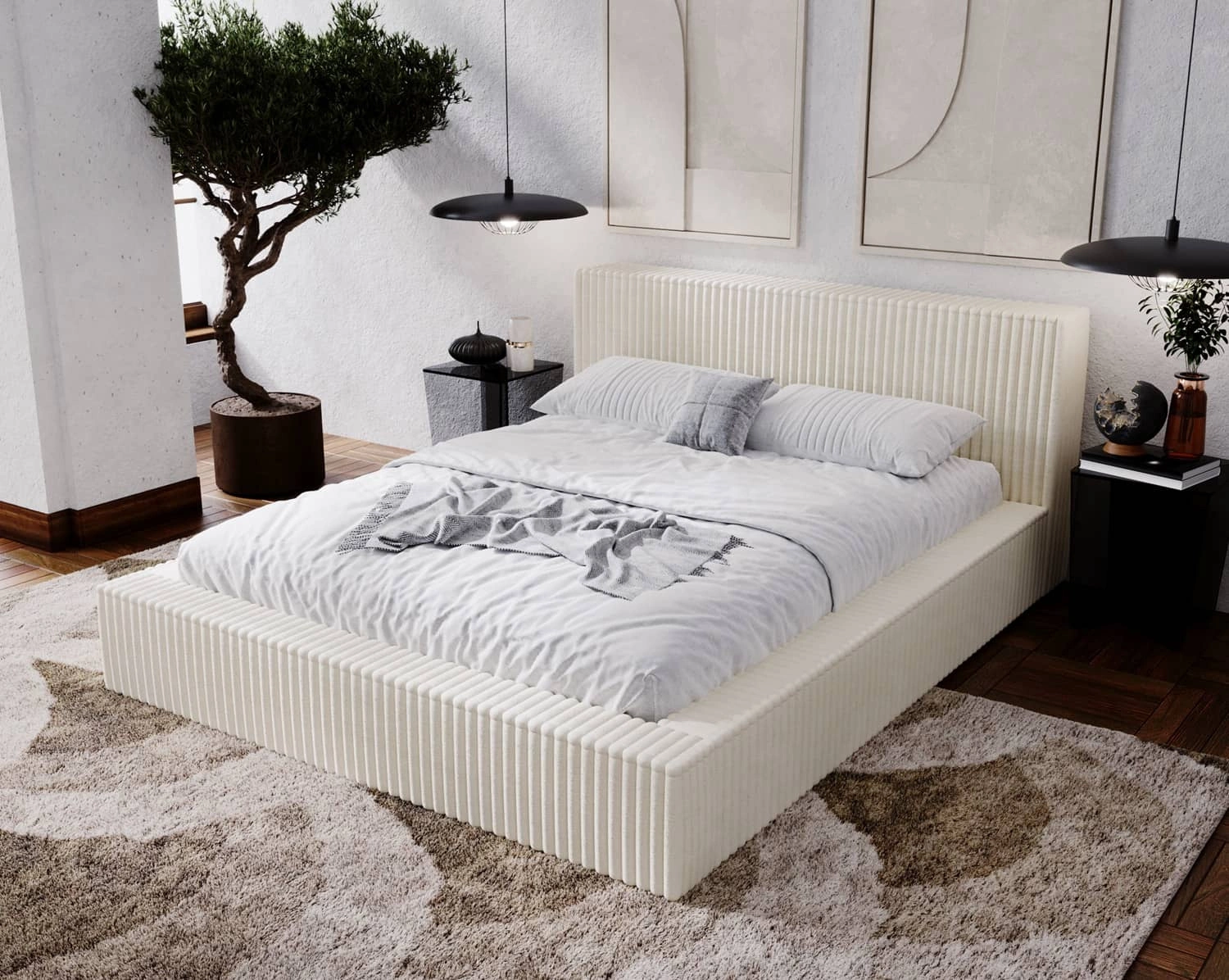 Łóżko tapicerowane Tilo 180x200 kremowe nowoczesny design łóżko z pojemnikiem na pościel z komfortowym zagłówkiem tkanina z wyrazistymi prążkami