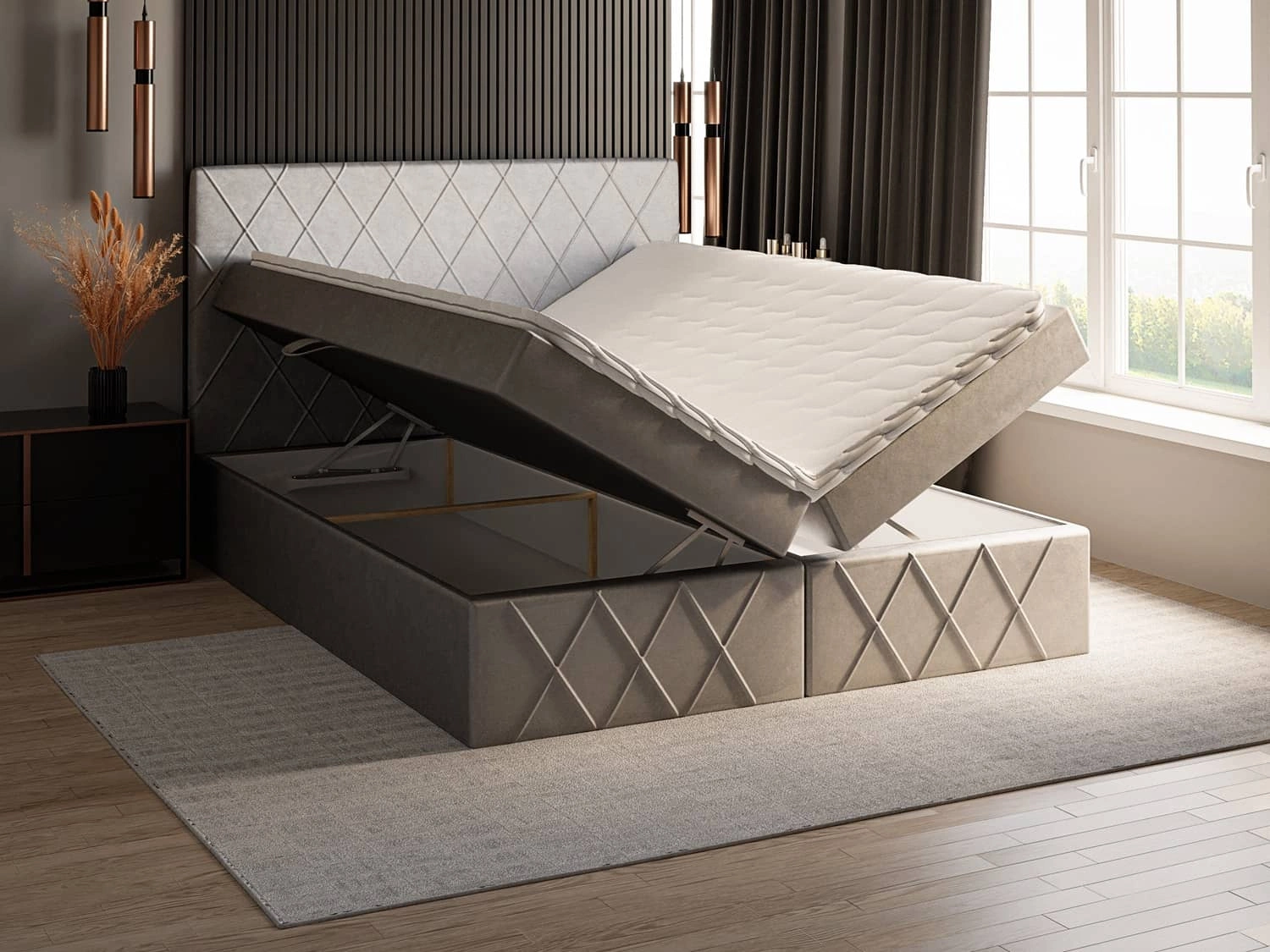 Dla większej funkcjonalności łóżko kontynentalne jest wyposażone w dwa pojemniki, które umożliwią wygodne przechowywanie niezbędnych akcesoriów. Dostęp do pojemników łóżka jest możliwy po podniesieniu materaca. Niezawodne automaty wspomagające podnoszenie ułatwią tę czynność.