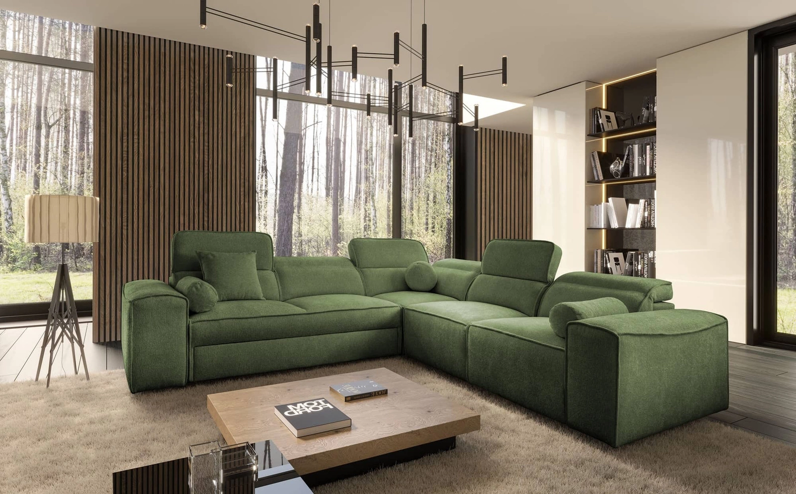 Narożnik z funkcją spania Viano III zielony prawostronny stylowy narożnik z pojemnikami na pościel doskonały do nowoczesnych wnętrz