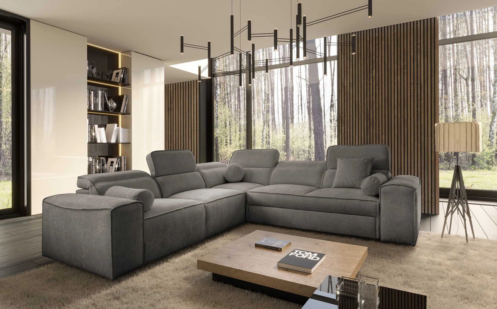 Narożnik z funkcją spania Viano III szary lewostronny stylowy narożnik z pojemnikami na pościel doskonały do nowoczesnych wnętrz