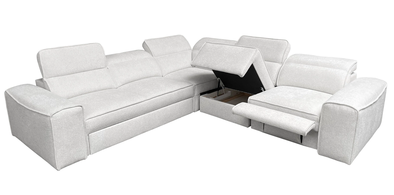 Dodatki tego mebla, które docenią wszyscy użytkownicy to wysuwany podnóżek, pojemnik na pościel, regulowane zagłówki, szerokie podłokietniki oraz poduszki ozdobne w różnych kształtach.