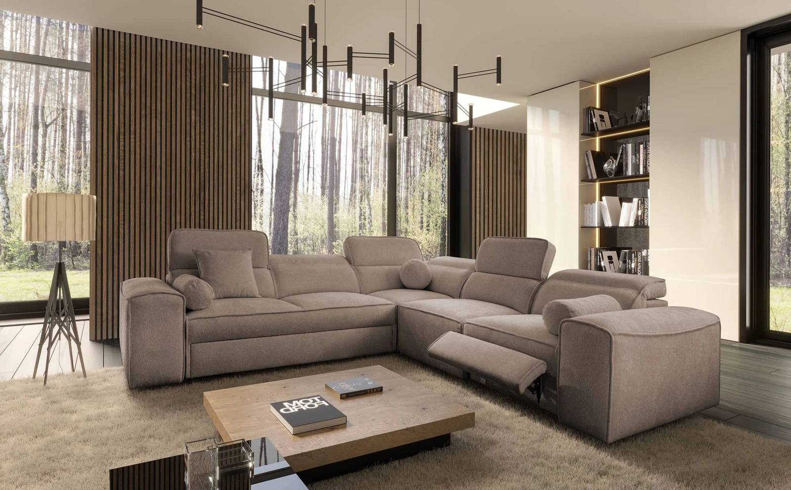 Narożnik Viano III Lux w kolorze jasny brąz z wysuwanym podnóżkiem to ciekawie prezentujący się mebel o eleganckim wykończeniu.