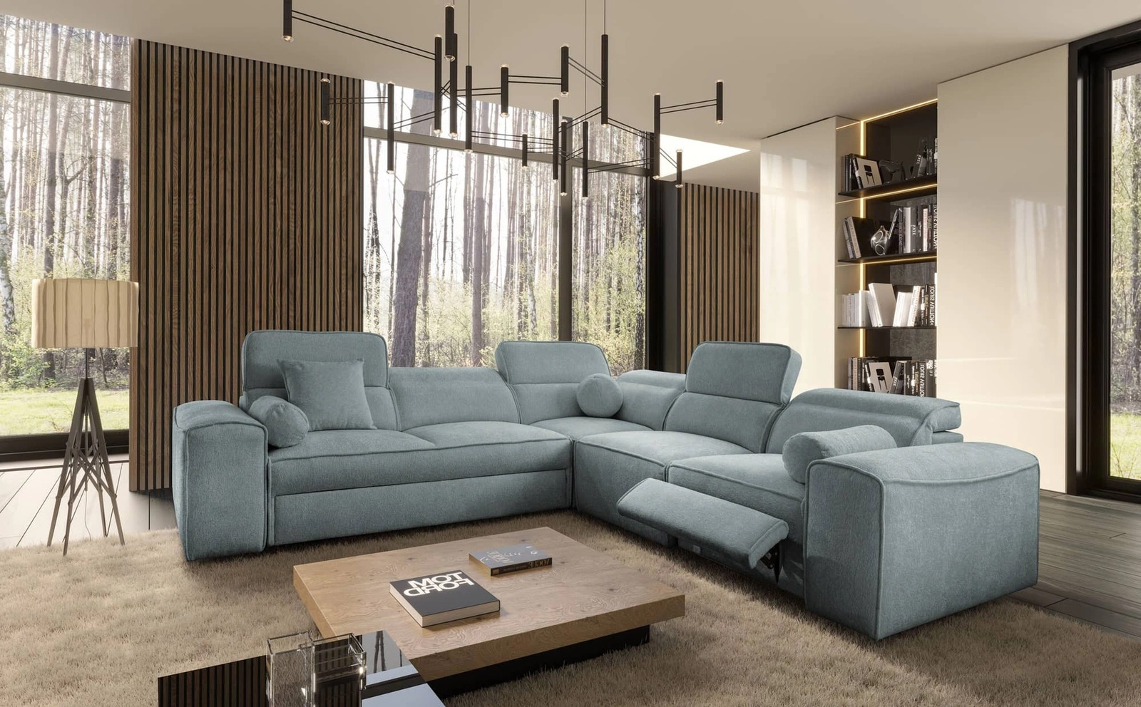 Narożnik Viano III Lux w kolorze szary błękit z wysuwanym podnóżkiem to ciekawie prezentujący się mebel o eleganckim wykończeniu.