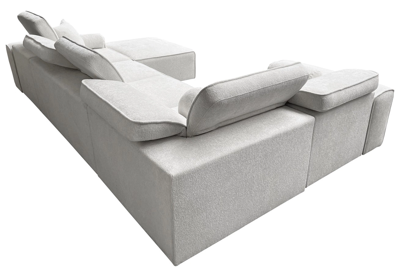 Wymiary mebla pozwolą na zagospodarowanie przestrzeni w przestronnym salonie lub pokoju dziennym. Szerokość narożnika 343 cm, wysokość 91 cm oraz głębokość 205 cm. Powierzchnia spania narożnika wynosi 127x268 cm. Wysokość siedziska mebla to 42 cm a wysokość oparcia wynosi 56 cm. Sprężyny faliste oraz pianka poliuretanowa T30 to materiał, z którego wykonane zostało siedzisko narożnika. Oparcie stałe z regulowanymi zagłówkami pozwoli na łatwe dostosowanie kąta nachylenia zagłówków do swoich preferencji oraz daje gwarancję wygodnego wypoczynku po długim dniu, które docenisz Ty, Twoi bliscy a także goście, którzy zasiądą na tym wyjątkowym narożniku.