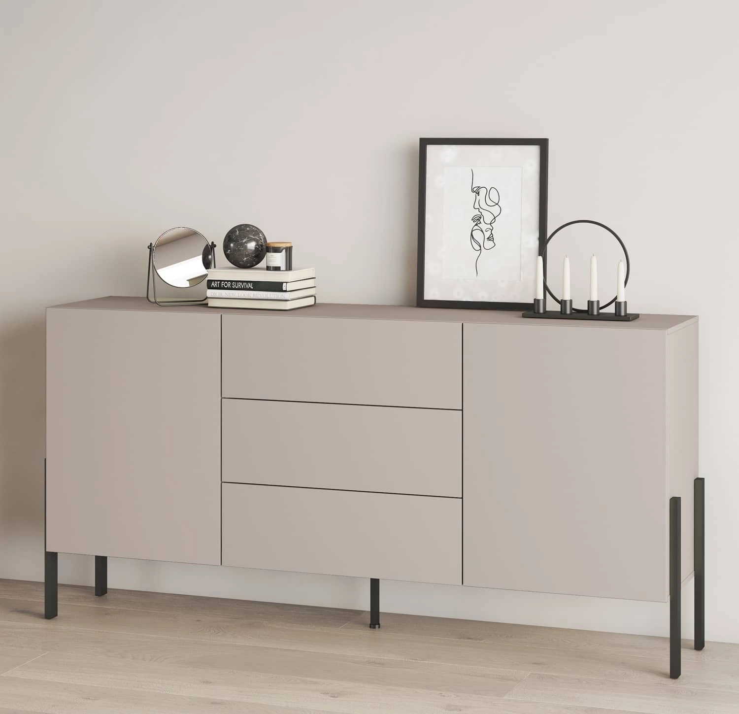 Komoda z szufladami Jukon 184 cm beżowa elegancka forma mebla w nowoczesnym stylu system otwierania push to open metalowe czarne nogi