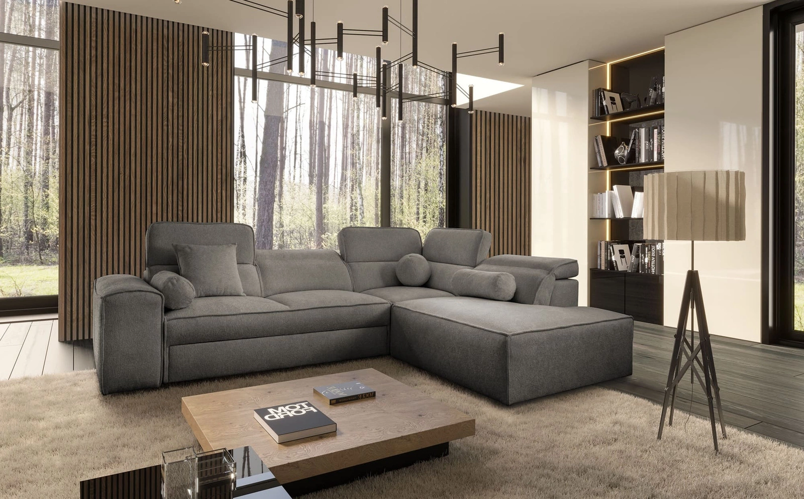 Narożnik z funkcją spania Viano VII szary prawostronny modny i stylowy narożnik z regulowanymi zagłówkami ozdobne poduszki