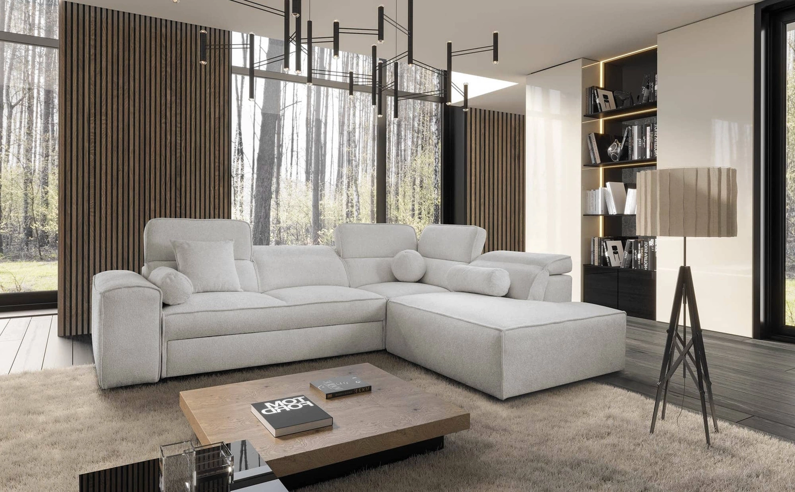Narożnik z funkcją spania Viano VII szary popiel prawostronny modny i stylowy narożnik z regulowanymi zagłówkami ozdobne poduszki