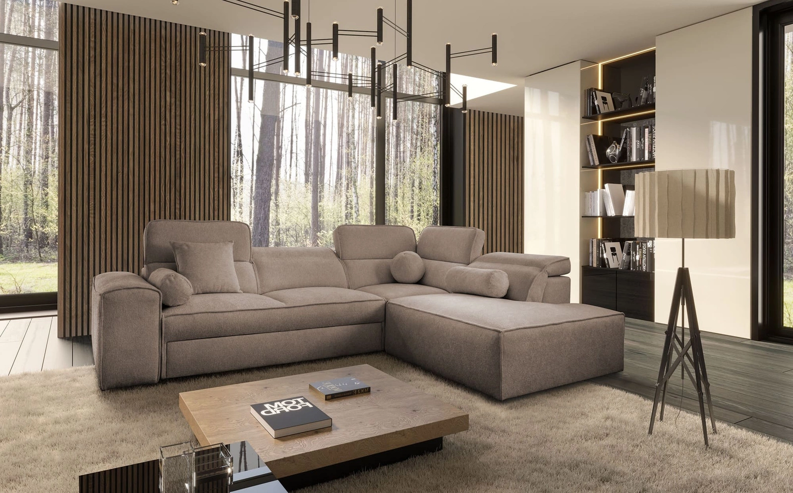 Narożnik z funkcją spania Viano VII jasny brąz prawostronny modny i stylowy narożnik z regulowanymi zagłówkami ozdobne poduszki