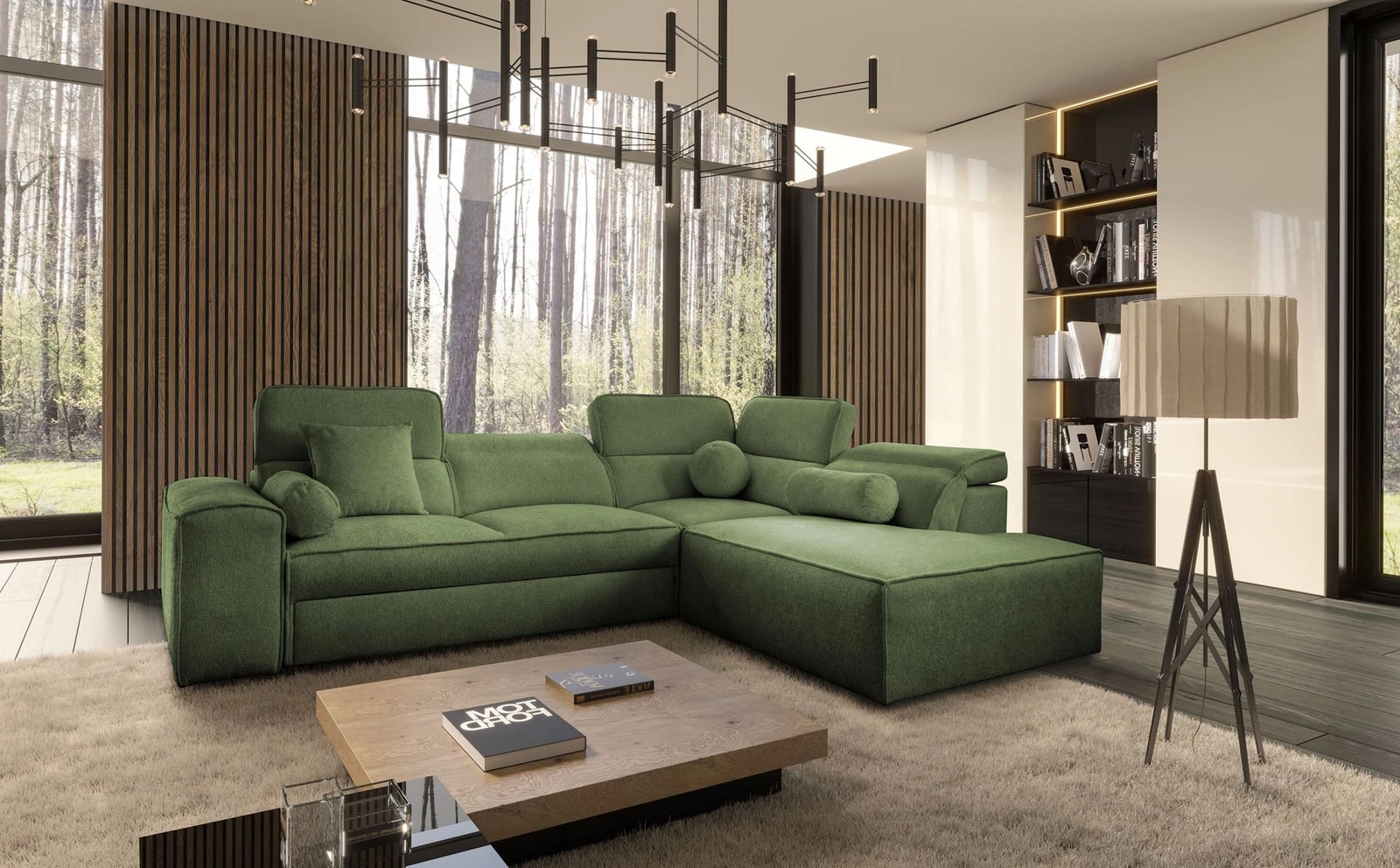 Narożnik z funkcją spania Viano VII zielony prawostronny modny i stylowy narożnik z regulowanymi zagłówkami ozdobne poduszki