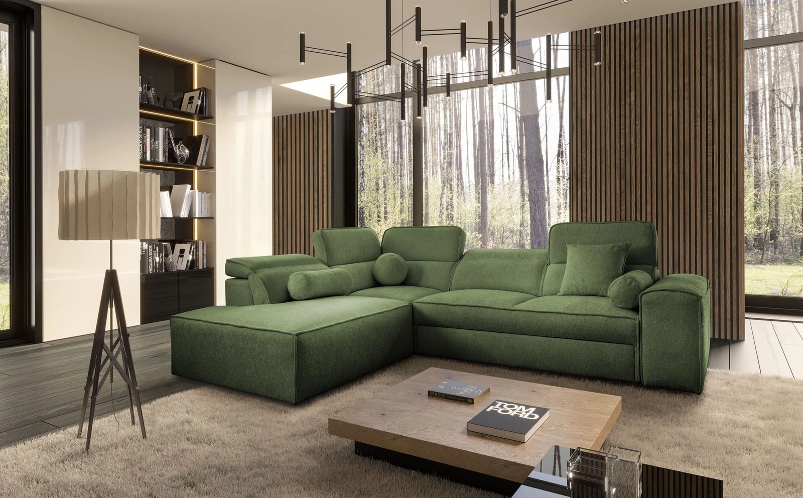 Narożnik z funkcją spania Viano VII zielony lewostronny modny i stylowy narożnik z regulowanymi zagłówkami ozdobne poduszki