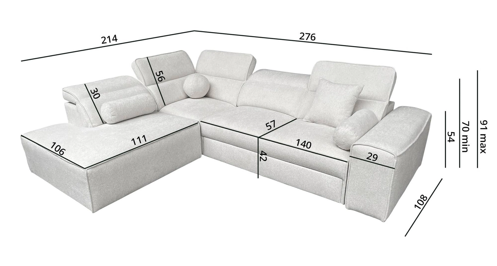 Wymiary mebla pozwolą na zagospodarowanie przestrzeni w przestronnym salonie lub pokoju dziennym. Szerokość narożnika 276 cm, wysokość 91 cm oraz głębokość 214 cm. Powierzchnia spania narożnika wynosi 127x198 cm. Wysokość siedziska mebla to 42 cm a wysokość oparcia wynosi 56 cm. Sprężyny faliste oraz pianka poliuretanowa T30 to materiał, z którego wykonane zostało siedzisko narożnika. Oparcie stałe z regulowanymi zagłówkami pozwoli na łatwe dostosowanie kąta nachylenia zagłówków do swoich preferencji oraz daje gwarancję wygodnego wypoczynku po długim dniu, które docenisz Ty, Twoi bliscy a także goście, którzy zasiądą na tym wyjątkowym narożniku.