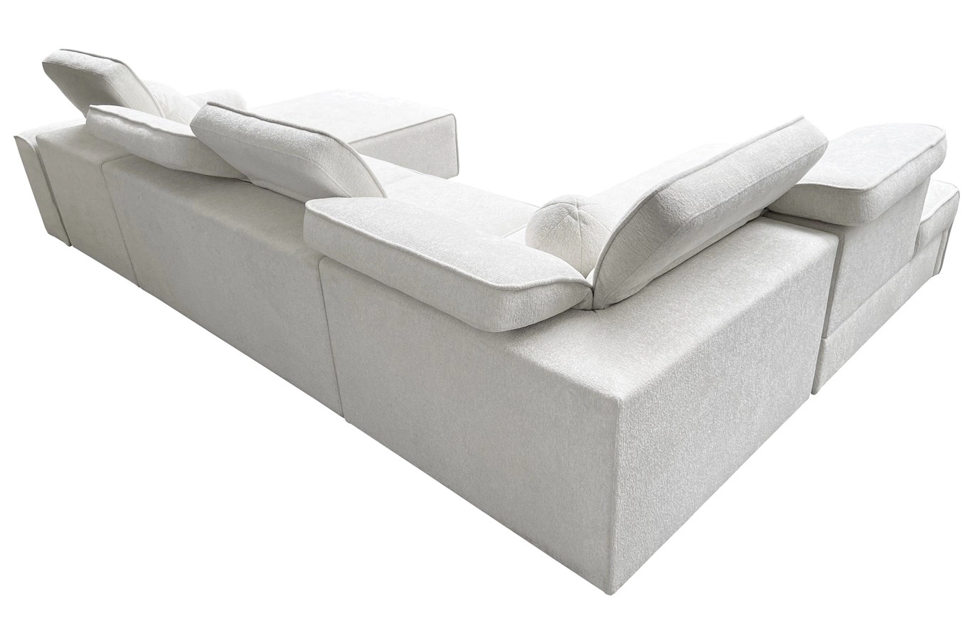 Wymiary mebla pozwolą na zagospodarowanie przestrzeni w przestronnym salonie lub pokoju dziennym. Szerokość narożnika 343 cm, wysokość 91 cm oraz głębokość 216 cm. Powierzchnia spania narożnika wynosi 127x268 cm. Wysokość siedziska mebla to 42 cm a wysokość oparcia wynosi 56 cm. Sprężyny faliste oraz pianka poliuretanowa T30 to materiał, z którego wykonane zostało siedzisko narożnika. Oparcie stałe z regulowanymi zagłówkami pozwoli na łatwe dostosowanie kąta nachylenia zagłówków do swoich preferencji oraz daje gwarancję wygodnego wypoczynku po długim dniu, które docenisz Ty, Twoi bliscy a także goście, którzy zasiądą na tym wyjątkowym narożniku.