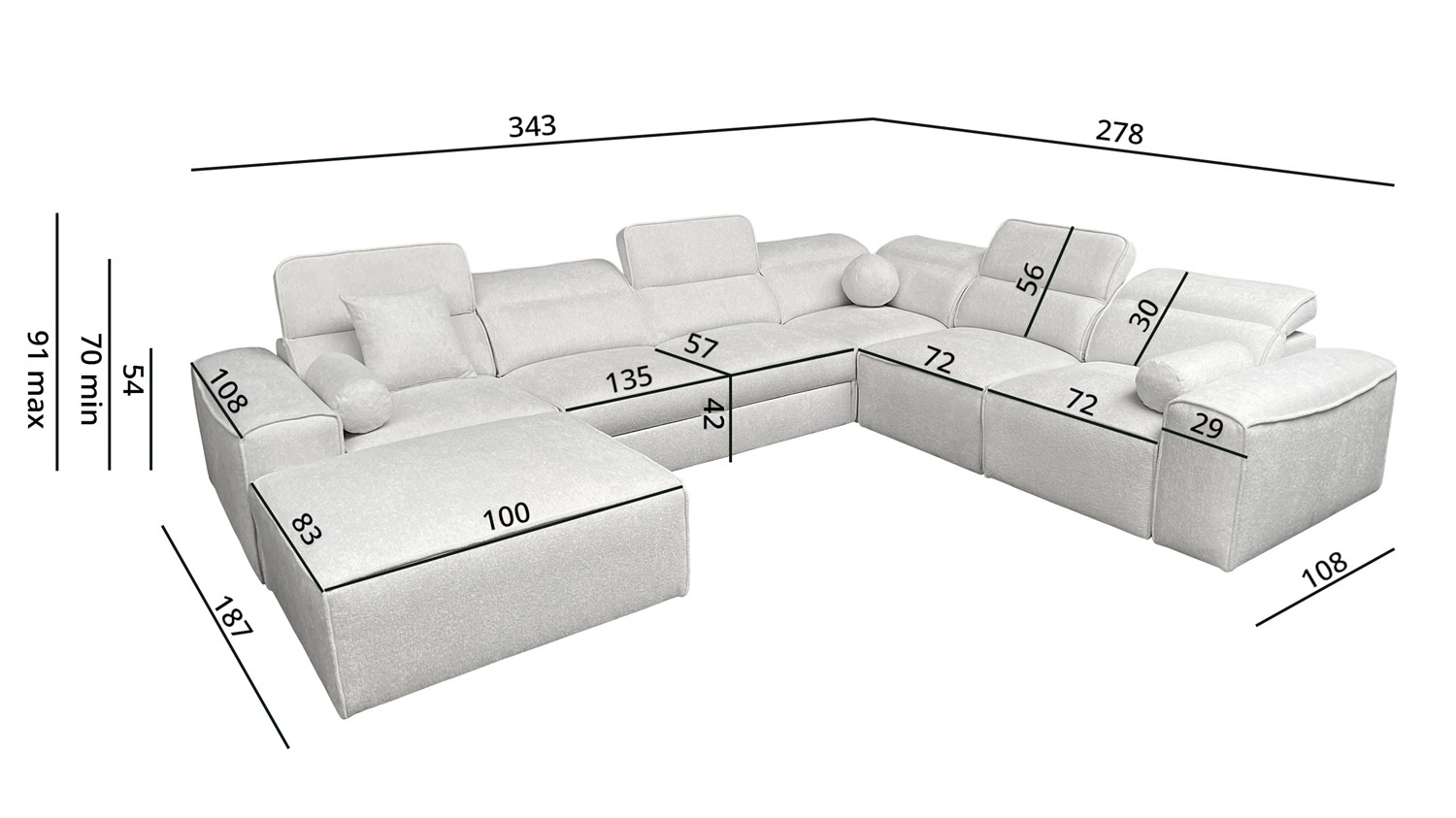 Wymiary mebla pozwolą na zagospodarowanie przestrzeni w przestronnym salonie lub pokoju dziennym. Szerokość narożnika 343 cm, wysokość 91 cm oraz głębokość 278 cm. Powierzchnia spania narożnika wynosi 127x268 cm. Wysokość siedziska mebla to 42 cm a wysokość oparcia wynosi 56 cm. Sprężyny faliste oraz pianka poliuretanowa T30 to materiał, z którego wykonane zostało siedzisko narożnika. Oparcie stałe z regulowanymi zagłówkami pozwoli na łatwe dostosowanie kąta nachylenia zagłówków do swoich preferencji oraz daje gwarancję wygodnego wypoczynku po długim dniu, które docenisz Ty, Twoi bliscy a także goście, którzy zasiądą na tym wyjątkowym narożniku.