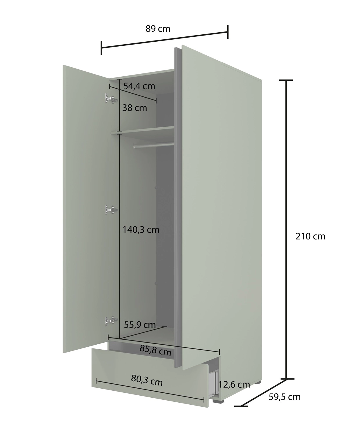 Szafa jest skonstruowana z 2 drzwi oraz 1 szuflady wysuwanej na prowadnicach rolkowych. Szafa wykonana została z wysokiej jakości płyty laminowanej o grubości 15mm, która charakteryzuje się odpornością na wpływ czynników zewnętrznych takich jak obicia, uderzenia i niefortunne zadrapania. Prosty design sprawia, że szafa na ubrania z powodzeniem sprawdzi się jako szafa do sypialni, jako szafa do przedpokoju lub szafa do pokoju dziecięcego. Szafa Cross będzie również świetnym wyborem do biura. Doskonale sprawdzi się także w roli garderoby do przedpokoju.