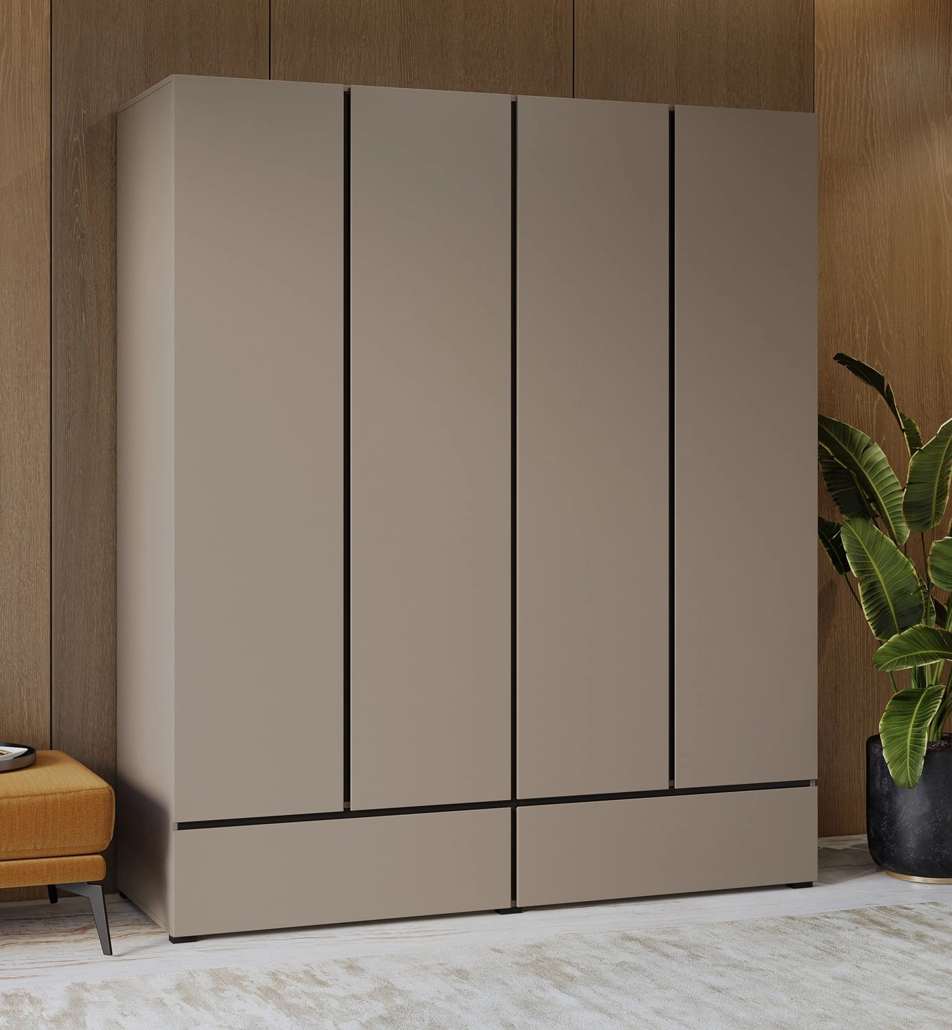 Szafa Cross 180 cm ciemny beżowy prosta forma w nowoczesnym wydaniu idealna szafa do sypialni lub garderoby geometryczny kształt pojemne szuflady