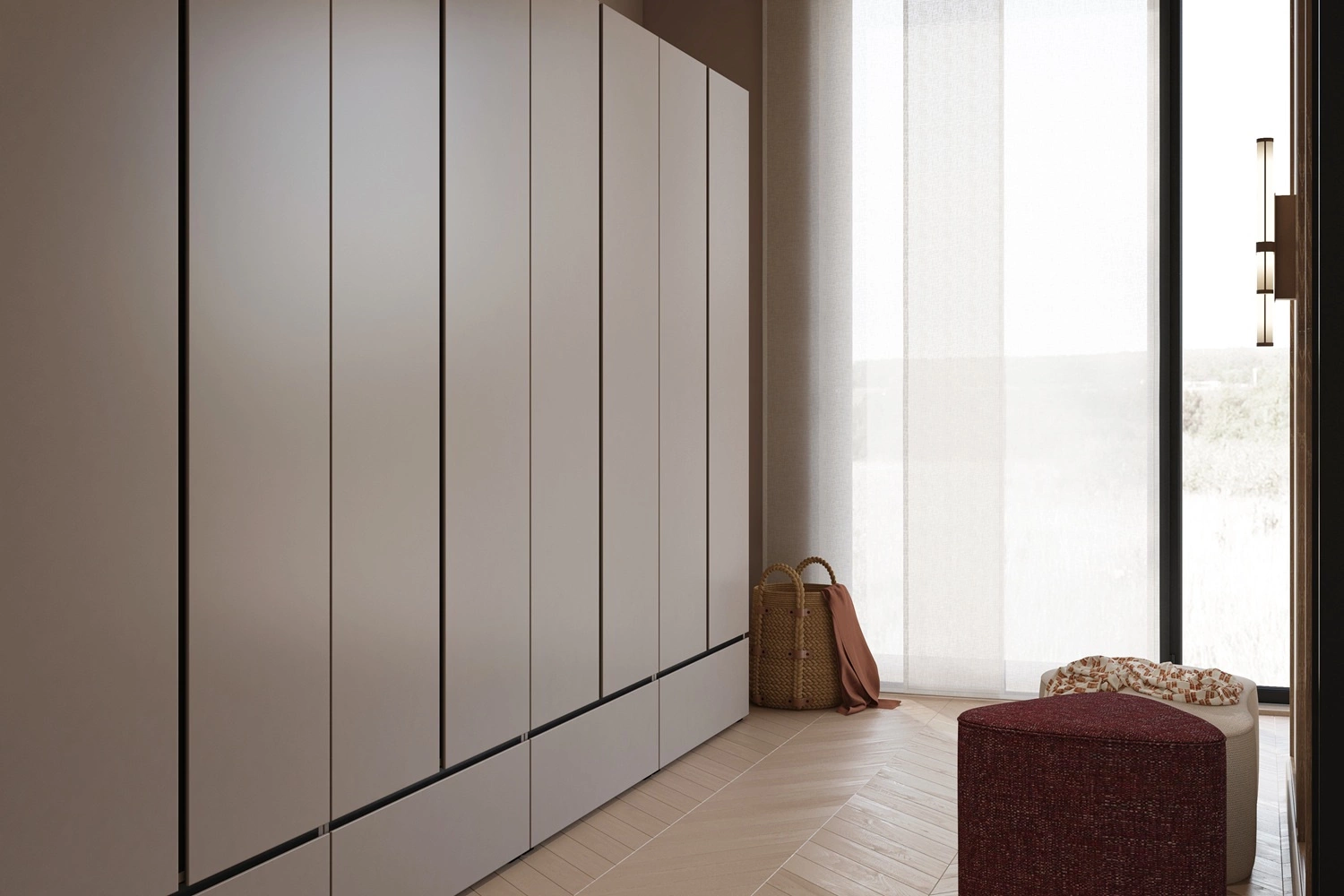 Szafa 180 cm Cross w kolorze ciemny beżowy to doskonała propozycja mebla dla miłośników minimalistycznych wnętrz.