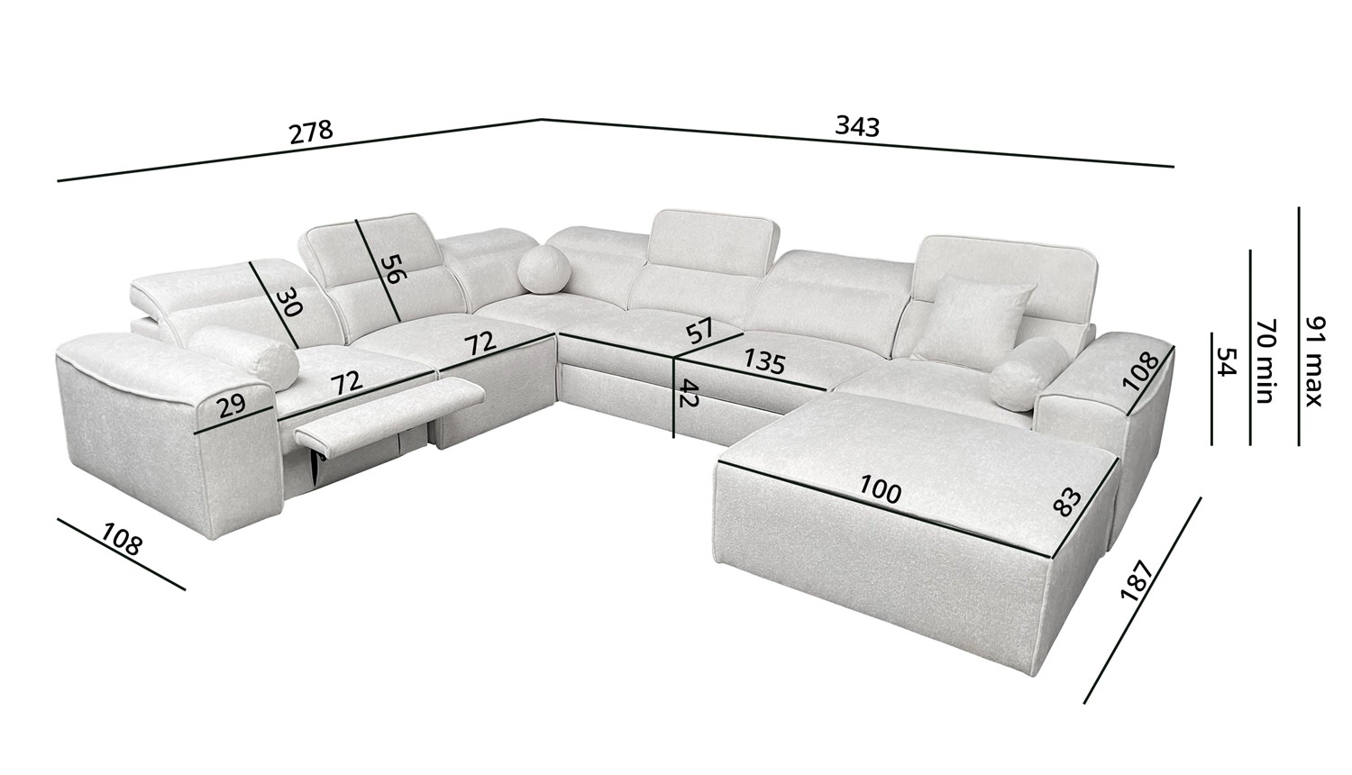 Wymiary mebla pozwolą na zagospodarowanie przestrzeni w przestronnym salonie lub pokoju dziennym. Szerokość narożnika 343 cm, wysokość 91 cm oraz głębokość 278 cm. Powierzchnia spania narożnika wynosi 127x268 cm. Wysokość siedziska mebla to 42 cm a wysokość oparcia wynosi 56 cm. Sprężyny faliste oraz pianka poliuretanowa T30 to materiał, z którego wykonane zostało siedzisko narożnika. Oparcie stałe z regulowanymi zagłówkami pozwoli na łatwe dostosowanie kąta nachylenia zagłówków do swoich preferencji oraz daje gwarancję wygodnego wypoczynku po długim dniu, które docenisz Ty, Twoi bliscy a także goście, którzy zasiądą na tym wyjątkowym narożniku.