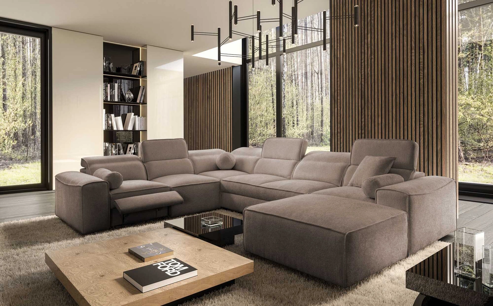 Narożnik Viano VIII Lux w kolorze jasny brąz z wysuwanym podnóżkiem to ciekawie prezentujący się mebel o eleganckim wykończeniu.