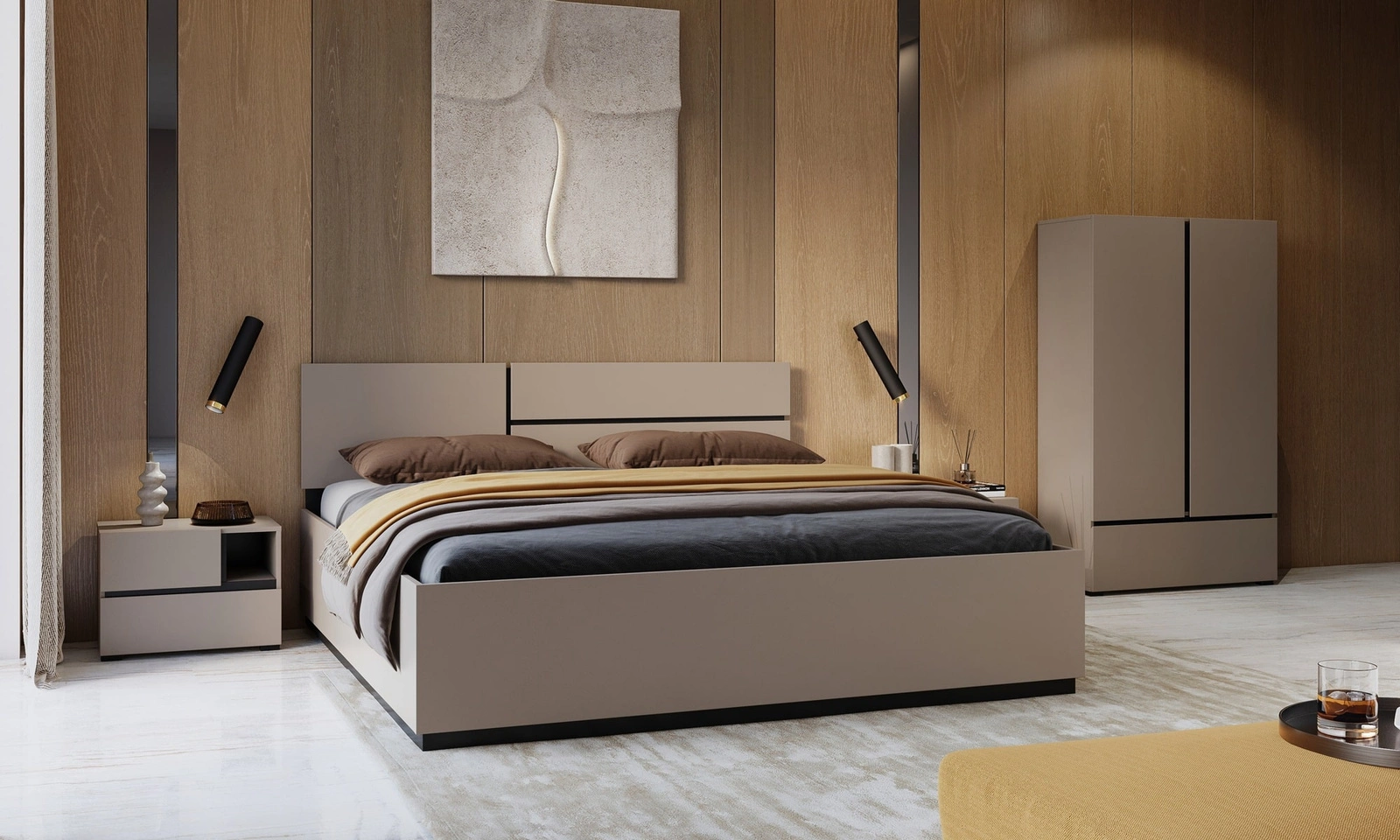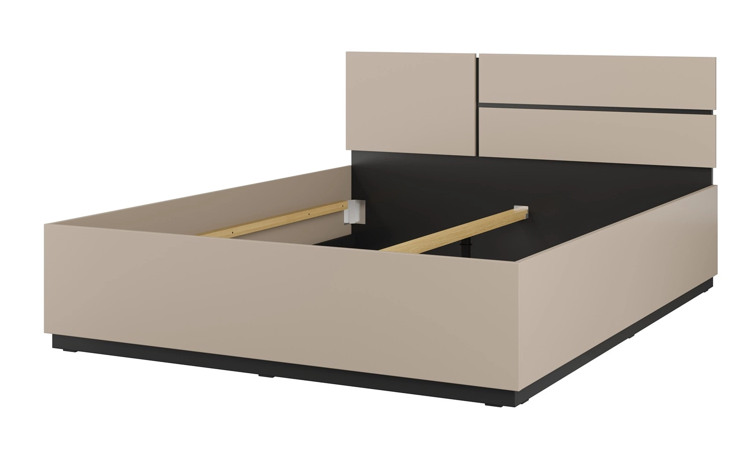 Łóżko Cross zachwyci wszystkich miłośników wyrafinowanych aranżacji. Mebel wyróżnia się prostotą oraz elegancją, a także zaskakuje szeroką funkcjonalnością. Oryginalna kolorystyka i geometryczny kształt stworzy niepowtarzalny klimat w każdym wnętrzu. Modny beżowy w ciemnym odcieniu znakomicie współgra z wstawkami w kolorze czarnym nadając meblom nowoczesnego wyglądu i kontrastu. Dzięki wysokiemu oparciu łóżko zyskuje kolejną funkcję. Można wygodnie siedzieć na łóżku, np. oglądając telewizję, pracując przy laptopie lub czytając książki.