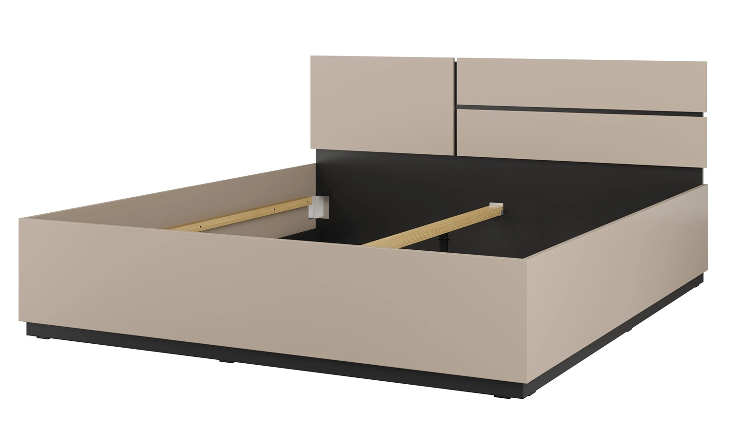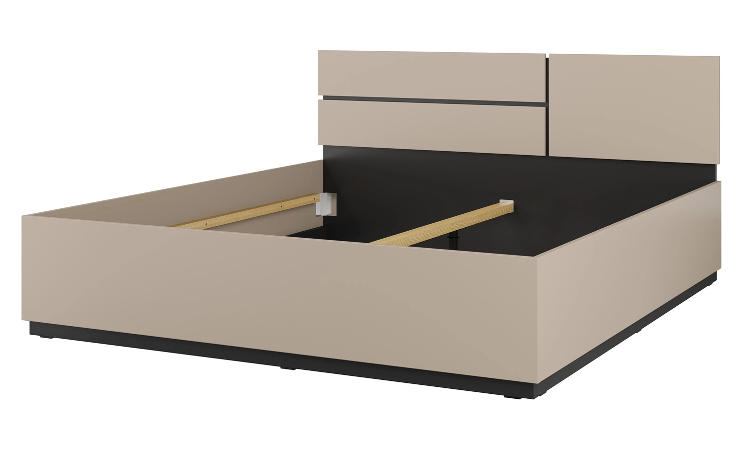 Łóżko Cross zachwyci wszystkich miłośników wyrafinowanych aranżacji. Mebel wyróżnia się prostotą oraz elegancją, a także zaskakuje szeroką funkcjonalnością. Oryginalna kolorystyka i geometryczny kształt stworzy niepowtarzalny klimat w każdym wnętrzu. Modny beżowy w ciemnym odcieniu znakomicie współgra z wstawkami w kolorze czarnym nadając meblom nowoczesnego wyglądu i kontrastu. Dzięki wysokiemu oparciu łóżko zyskuje kolejną funkcję. Można wygodnie siedzieć na łóżku, np. oglądając telewizję, pracując przy laptopie lub czytając książki.