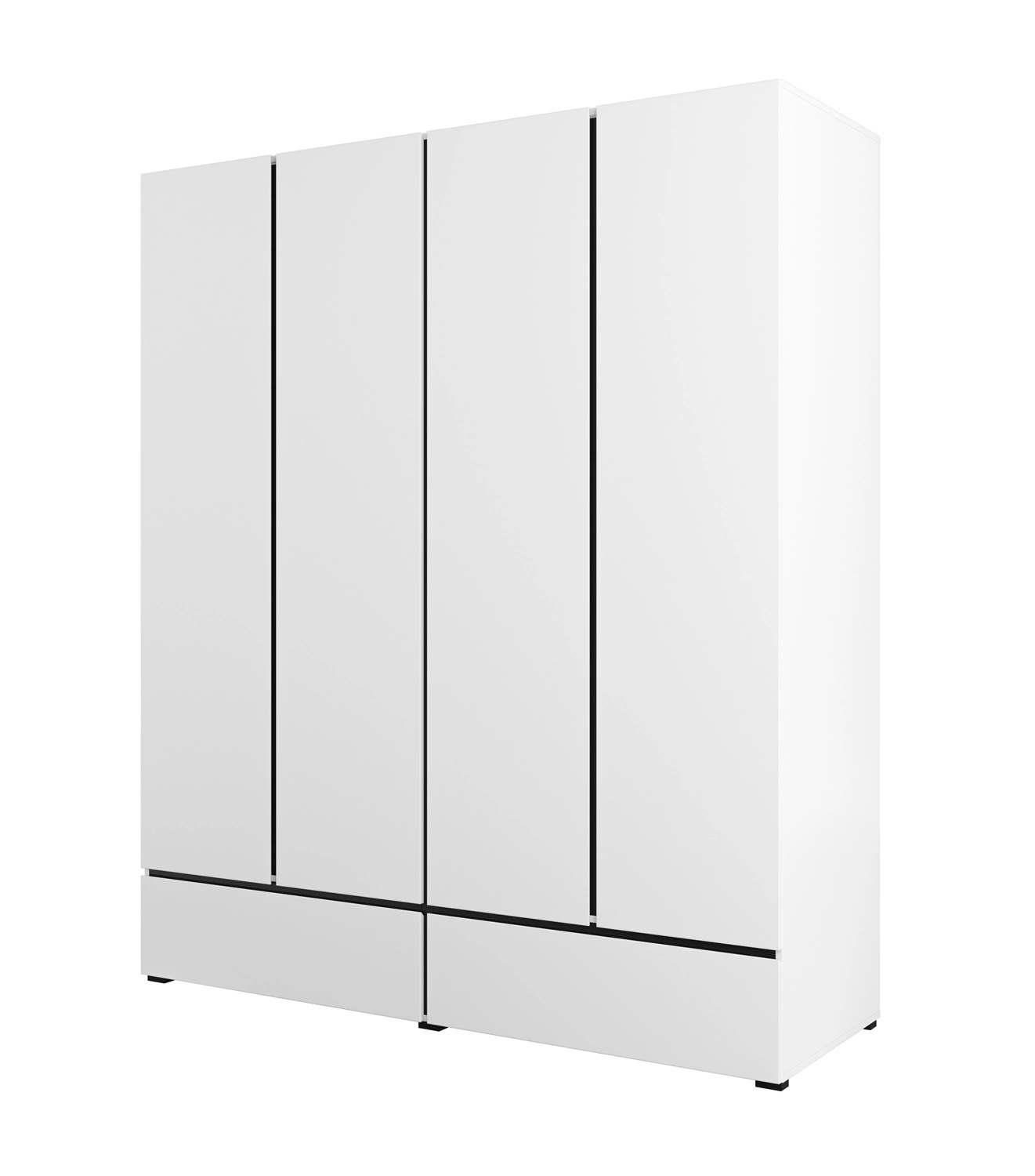 Szafa jest skonstruowana z 4 drzwi oraz 2 szuflad wysuwanych na prowadnicach rolkowych. Szafa wykonana została z wysokiej jakości płyty laminowanej o grubości 15mm, która charakteryzuje się odpornością na wpływ czynników zewnętrznych takich jak obicia, uderzenia i niefortunne zadrapania. Prosty design sprawia, że szafa na ubrania z powodzeniem sprawdzi się jako szafa do sypialni, jako szafa do przedpokoju lub szafa do pokoju dziecięcego. Szafa Cross będzie również świetnym wyborem do biura. Doskonale sprawdzi się także w roli garderoby do przedpokoju.