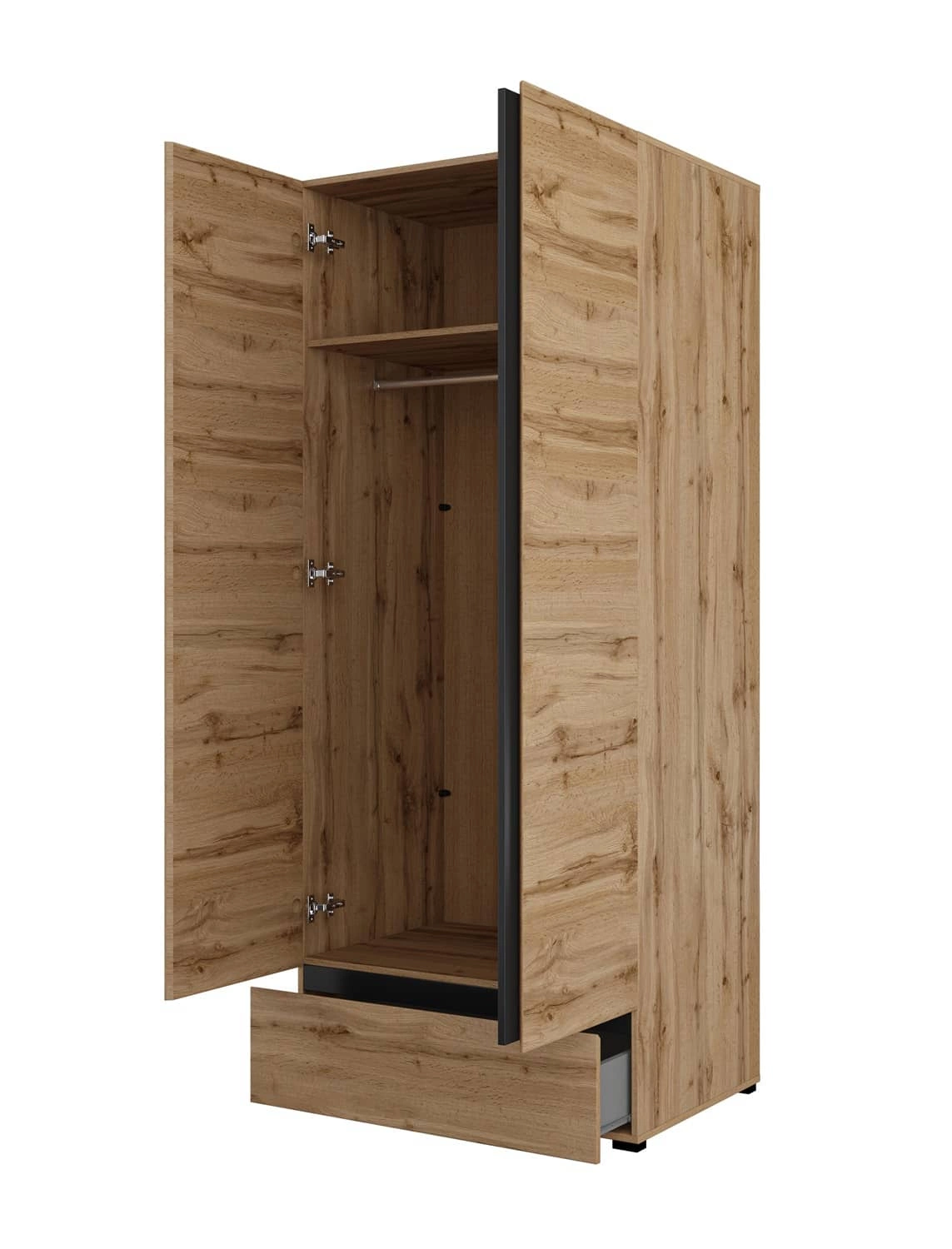 Szafa Cross zachwyci wszystkich miłośników wyrafinowanych aranżacji. Mebel wyróżnia się prostotą oraz elegancją, a także zaskakuje szeroką funkcjonalnością. Oryginalna kolorystyka i geometryczny kształt stworzy niepowtarzalny klimat w każdym wnętrzu. Ciepły odcień dębu wotan znakomicie współgra z wstawkami w kolorze czarnym nadając meblom nowoczesnego wyglądu i kontrastu. Takie zestawienie kolorystyczne doskonale oddaje unikatowy charakter szafy. Nietuzinkowym wykończeniem frontów szafy z szufladą są subtelnie frezowane uchwyty.