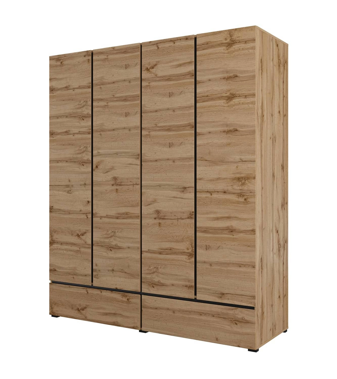 Szafa jest skonstruowana z 4 drzwi oraz 2 szuflad wysuwanych na prowadnicach rolkowych. Szafa wykonana została z wysokiej jakości płyty laminowanej o grubości 15mm, która charakteryzuje się odpornością na wpływ czynników zewnętrznych takich jak obicia, uderzenia i niefortunne zadrapania. Prosty design sprawia, że szafa na ubrania z powodzeniem sprawdzi się jako szafa do sypialni, jako szafa do przedpokoju lub szafa do pokoju dziecięcego. Szafa Cross będzie również świetnym wyborem do biura. Doskonale sprawdzi się także w roli garderoby do przedpokoju.