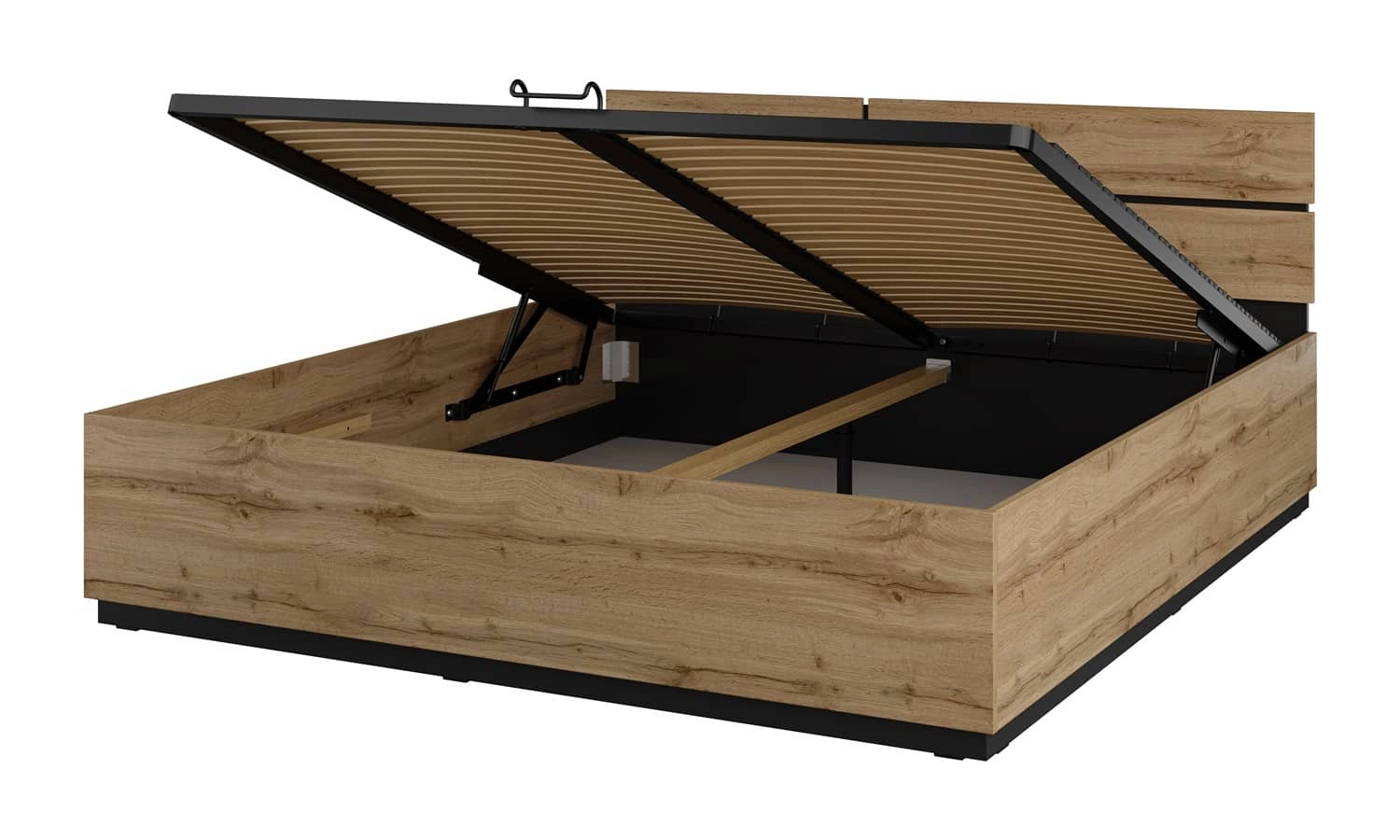 Łóżka do sypialni z kolekcji Cross wyposażone są w stabilny, metalowy stelaż pod materac. Łatwe i lekkie otwieranie ramy z materacem zapewniają podnośniki gazowe. Łóżko Cross gwarantuje komfortowe i bezproblemowe korzystanie oraz trwałość całego mebla przez wiele lat użytkowania. Połączenie ciepłego odcieniu dębu z czarnymi dodatkami sprawia, że łóżko świetnie sprawdzi się jako łóżko do sypialni lub łóżko młodzieżowe w pokoju nastolatka.